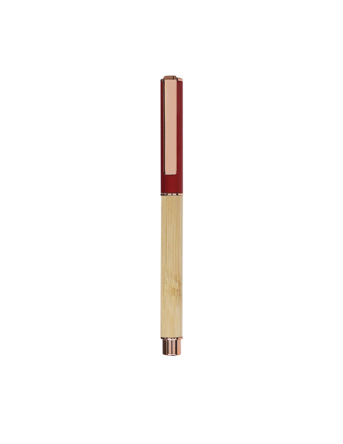 Elegante roller fabricado en bambú y aluminio. Con clip metálico, empuñadora y detalles de acabado oro rosa, caña fabricada en bambú y tapadera en aluminio. Con cartucho jumbo, en tinta azul y con cierre de capucha.