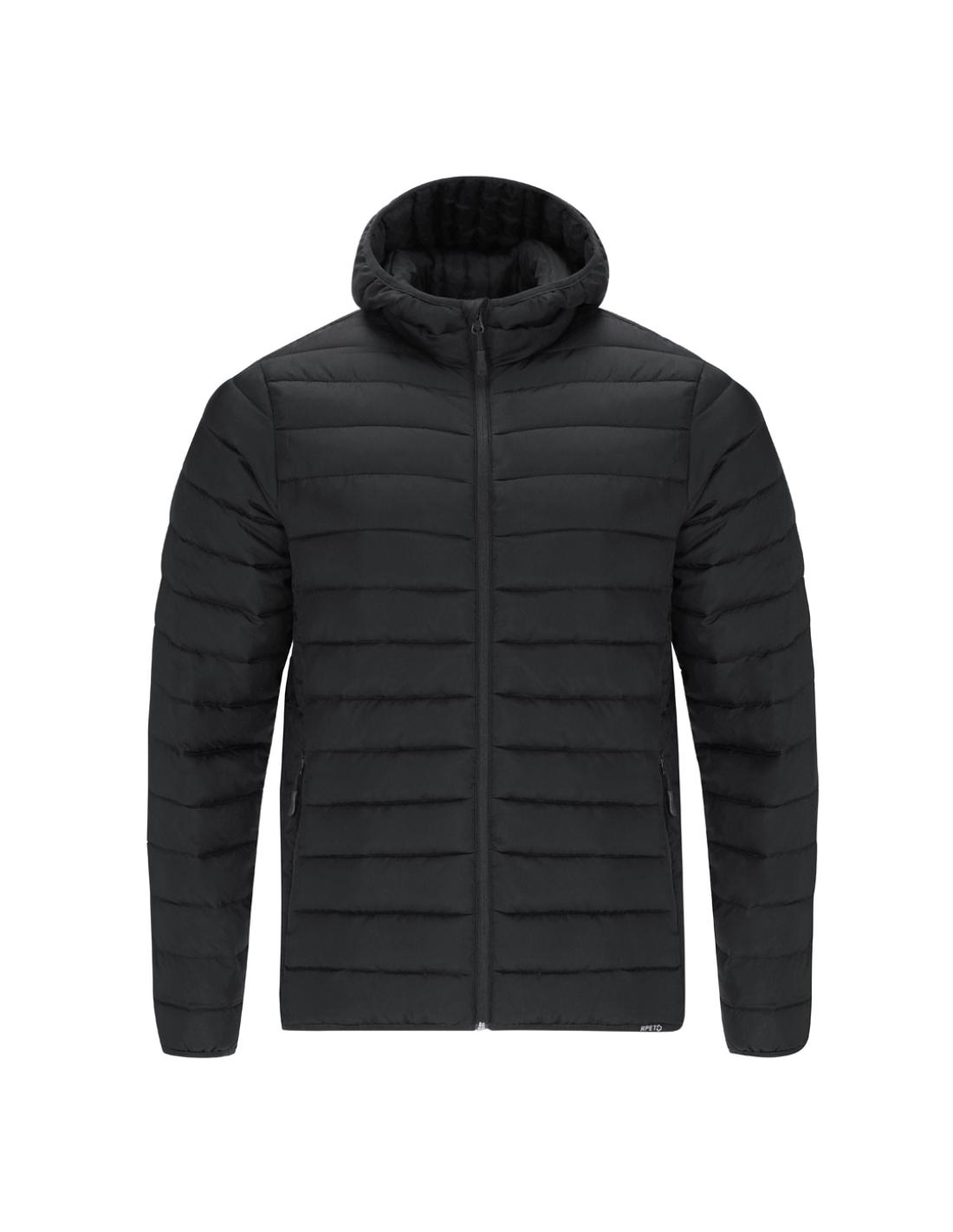 Chaqueta Unisex de RPET con capucha. En material extra ligero con acolchado efecto pluma y suave forro interior, resistente al agua y cortavientos. Puños, cintura y capucha con ribetes elásticos a tono. Apertura con cremallera invertida y tirador a juego, con protector de barbilla. Cuenta con 2 bolsillos exteriores laterales con cremalleras y tiradores a juego, y 2 bolsillos interiores. Etiqueta con distintivo RPET en el ribete de la prenda y práctica funda de transporte con cordón ajustable.