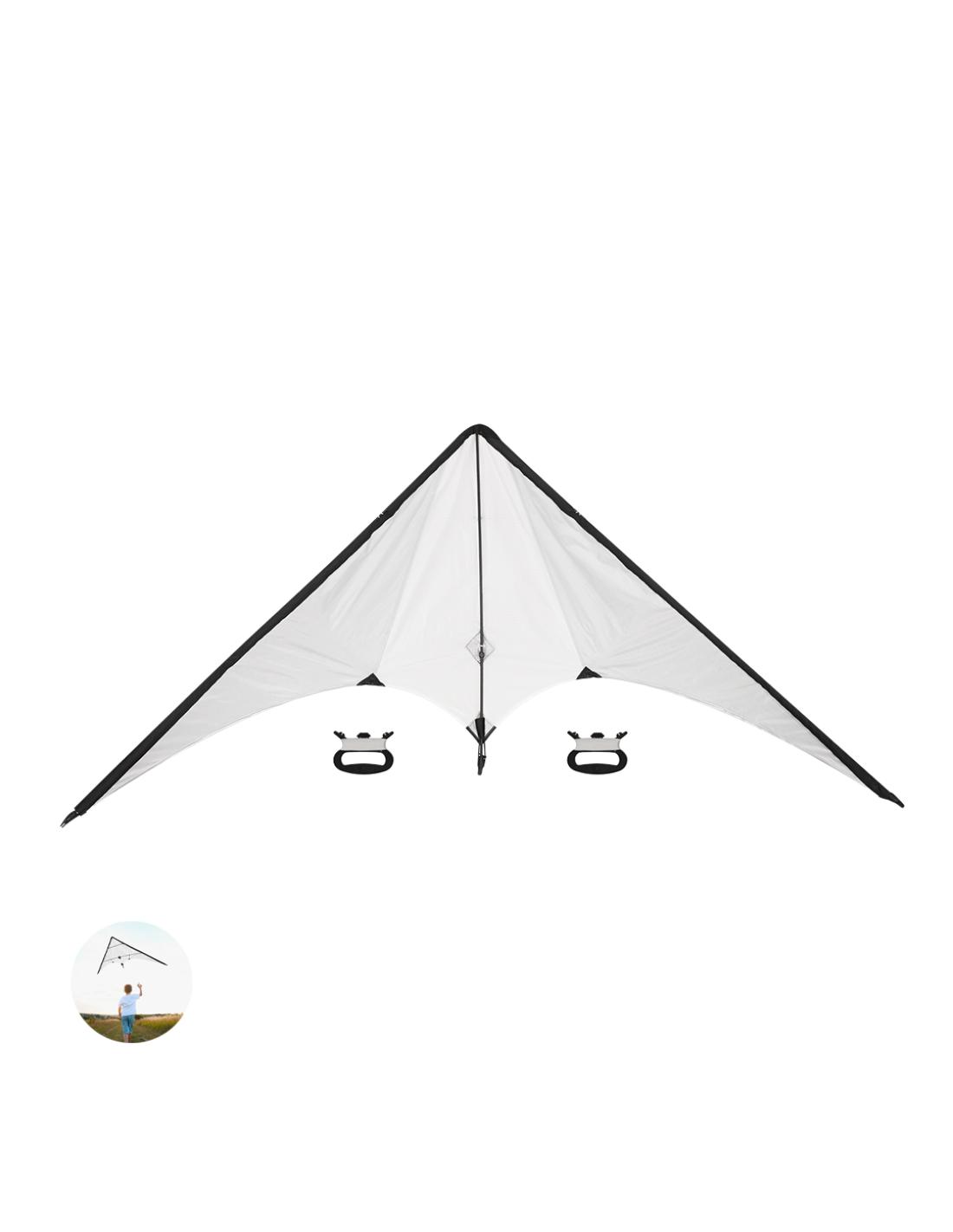 Cometa con diseño Delta fabricada en resistente poliéster RPET Ripstop 210T. Con estructura de fibra de vidrio que aporta estabilidad y facilidad de montaje. Incluye 2 asas de plástico con hilo para un manejo versátil y un control preciso durante el vuelo. Incluye práctica funda RPET de transporte con asa, perfecta para llevarla cómodamente a cualquier lugar. El material RPET se elabora a partir de plástico reciclado, para así fomentar la reutilización de residuos plásticos y ayudar a la sostenibilidad del planeta.
