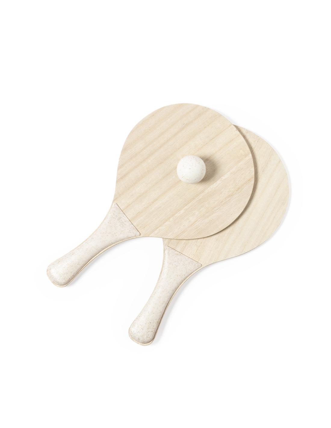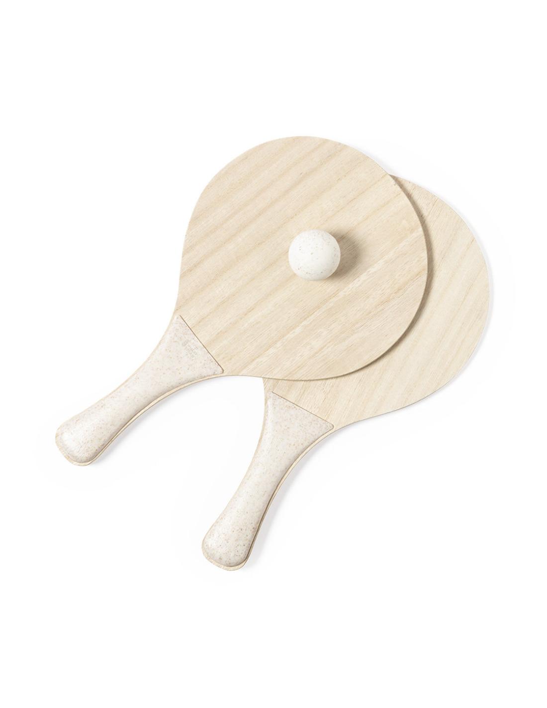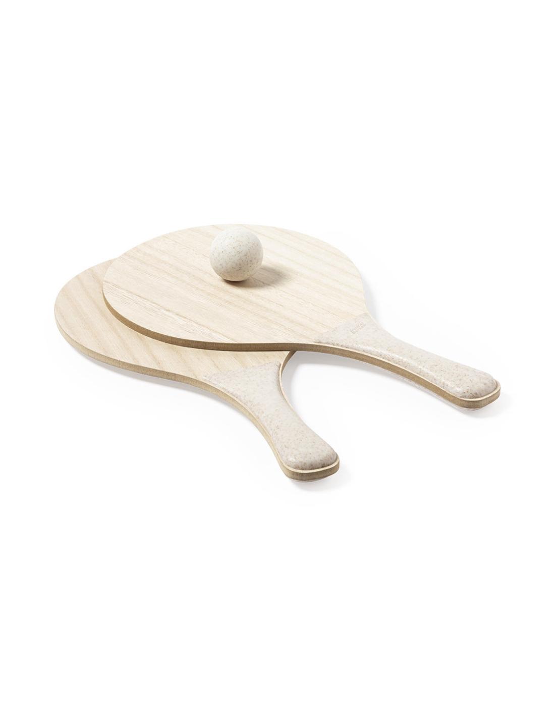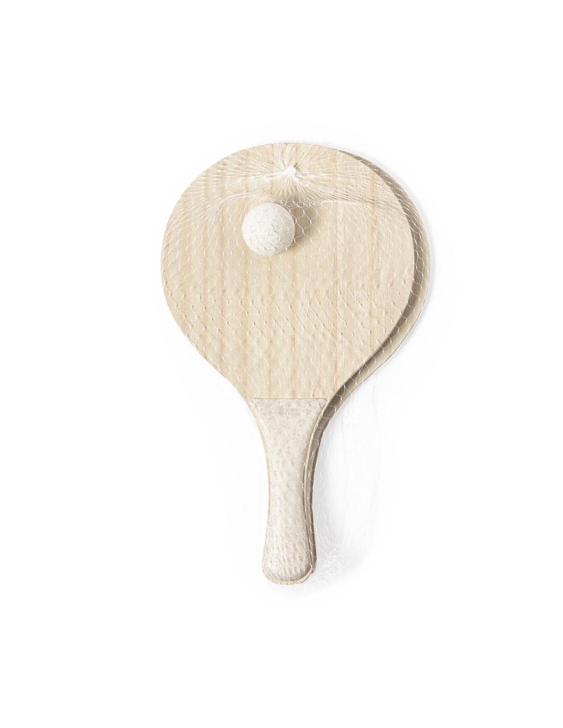 Par de palas de playa de línea nature. Fabricadas en madera, con mango reforzado en caña de trigo. Presentadas en bolsa de rejilla y con pelota de caña de trigo. Distintivo en el mango.