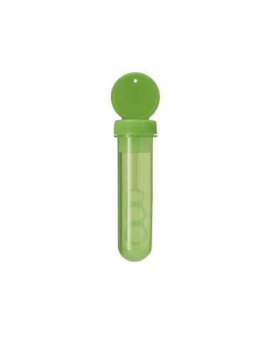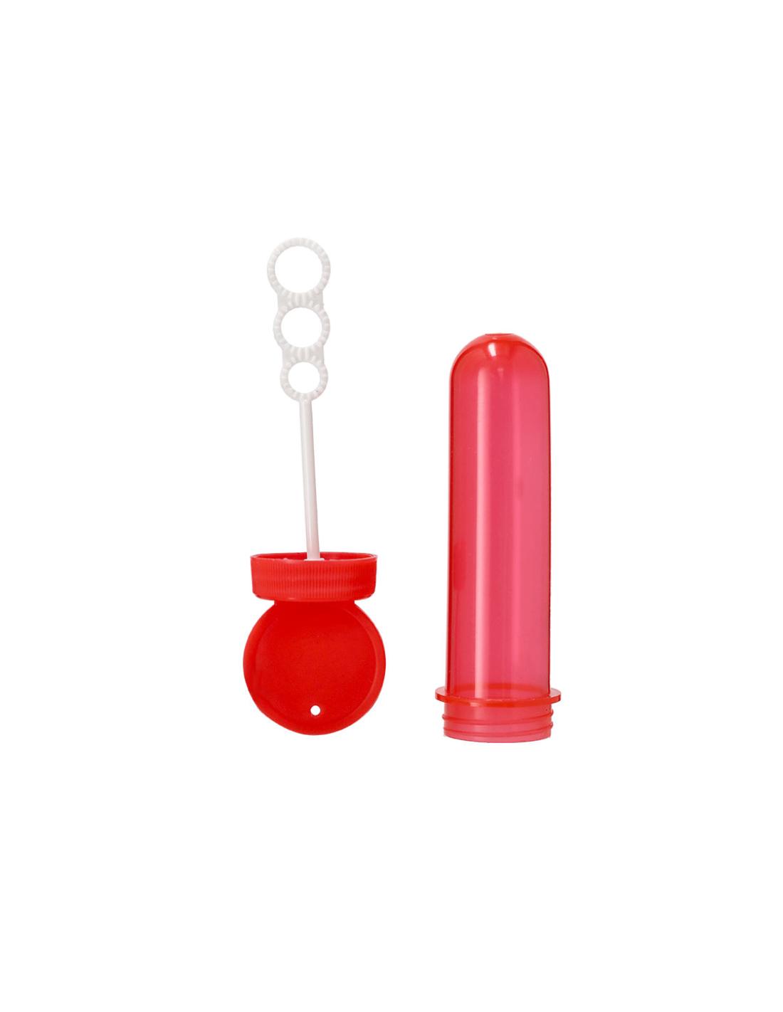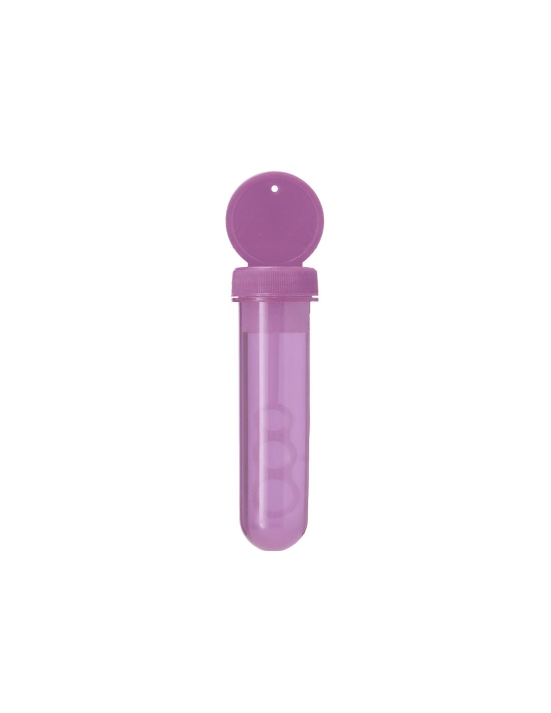 Pompero con aplicador especial que permite crear pompas en 3 tamaños. Líquido incluido (30 ml). Con tapadera de color sólido y cuerpo translúcido.