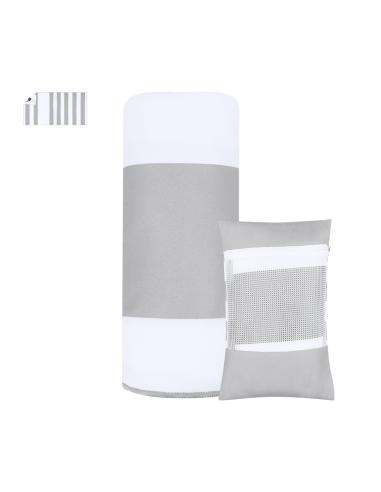 Toalla con bolsillo impermeable y funda. Fabricada en suave poliéster de 200g/m2, incluye práctico bolsillo impermeable triangular en la esquina, con cierre de cremallera ideal para proteger tus pertenencias personales. Su diseño a rayas, se complementa con una funda con rejilla y cierre de cremallera.