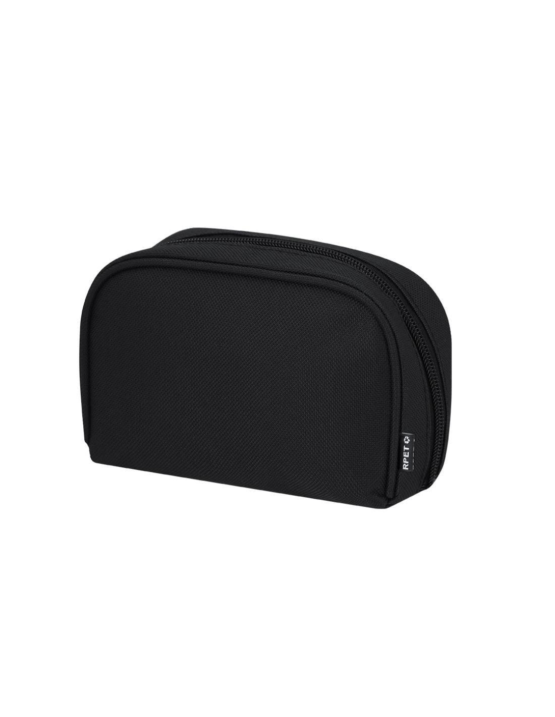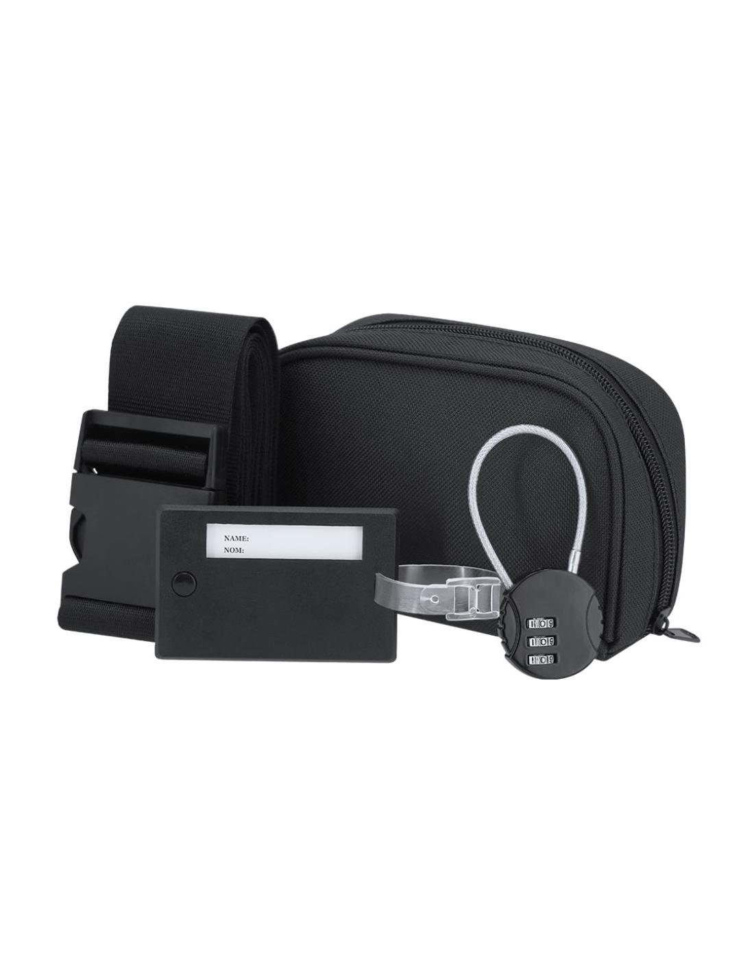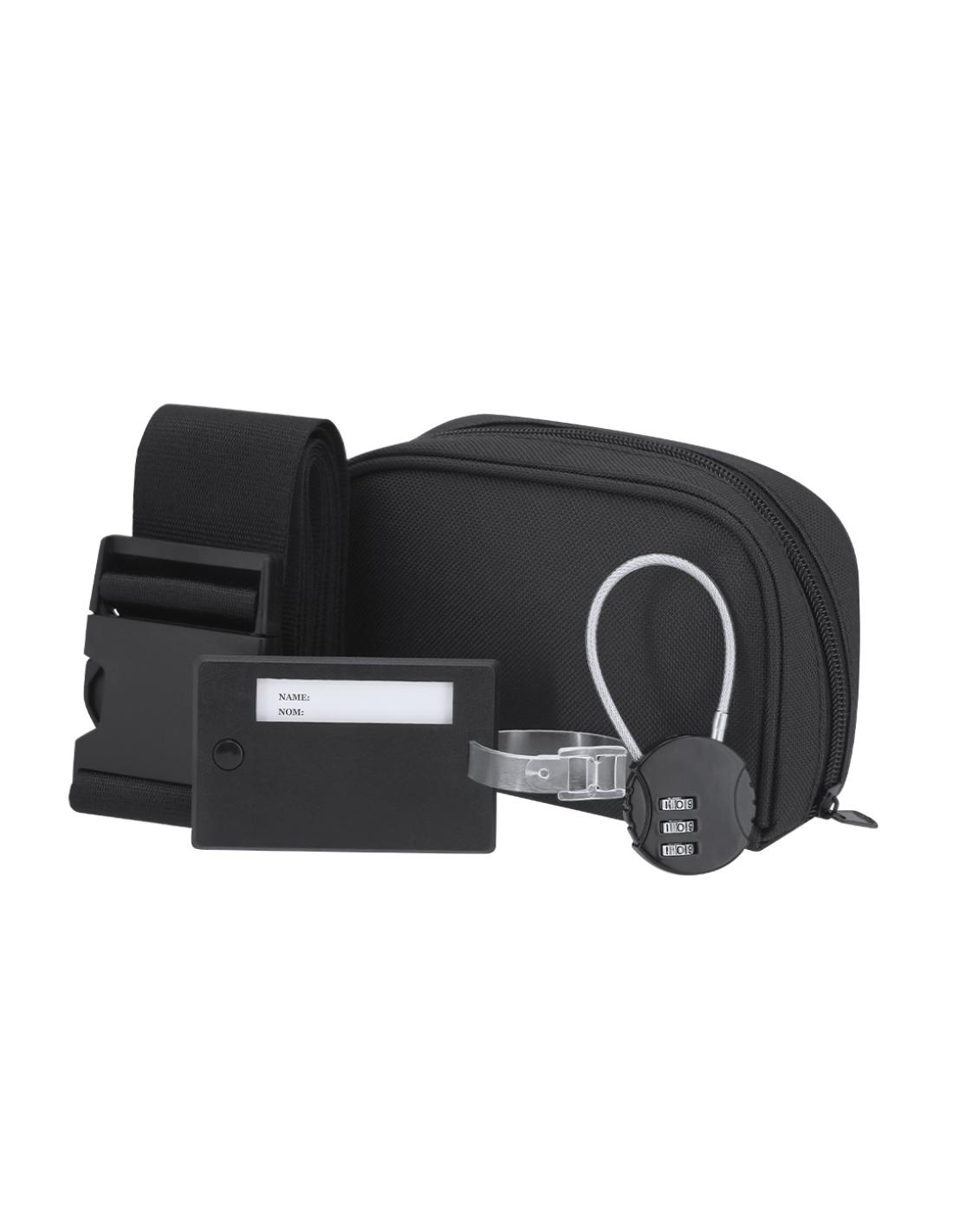 Set de viaje. Incluye: cinta ajustable para maletas, identificador de maletas y candado con contraseña numérica de 3 dígitos y cierre de cable de acero. Presentado en funda de RPET con cierre de cremallera y doble bolsillo interior. Incluye distintivo RPET.El material RPET se elabora a partir de plástico reciclado, para así fomentar la reutilización de residuos plásticos y ayudar a la sostenibilidad del planeta.
