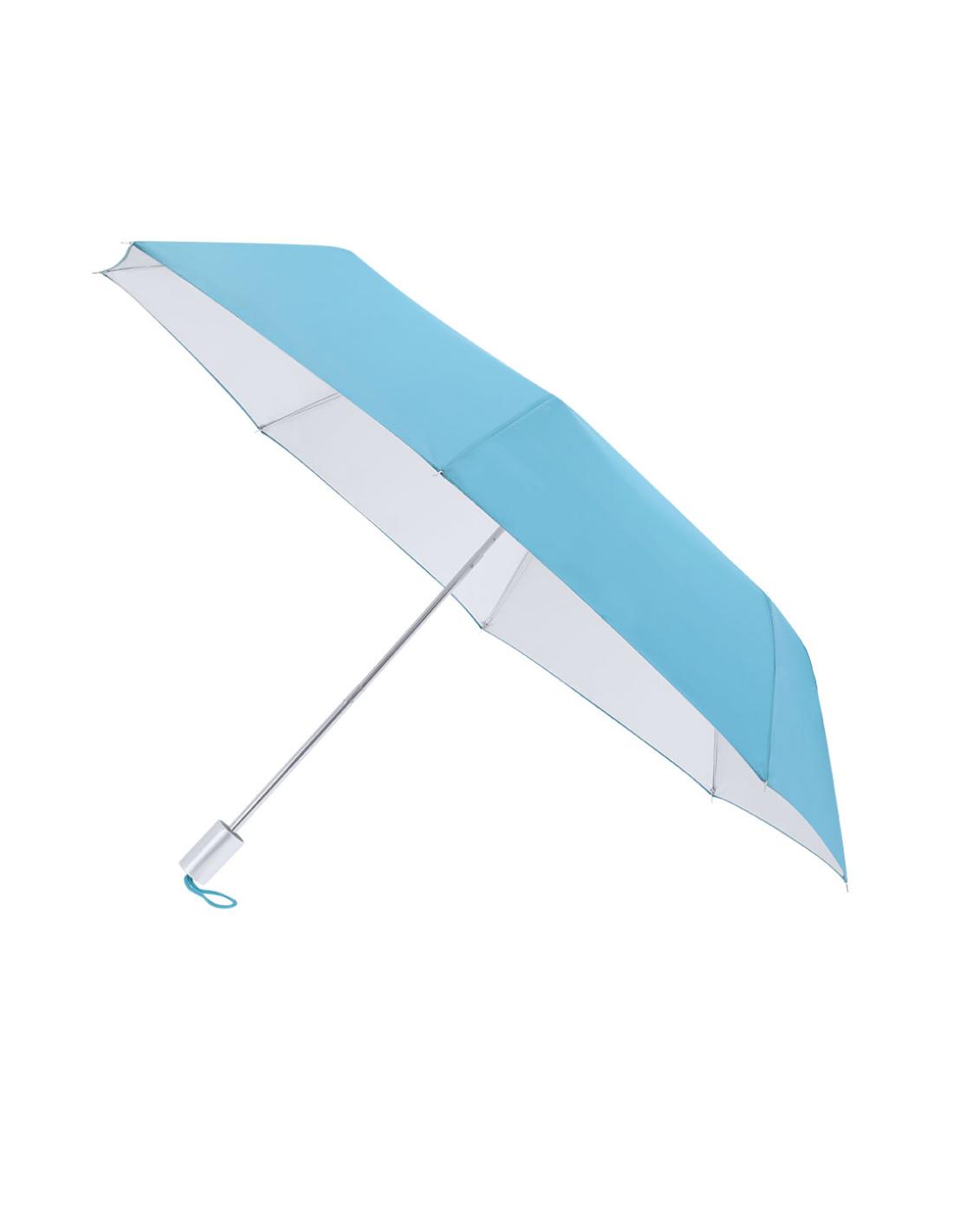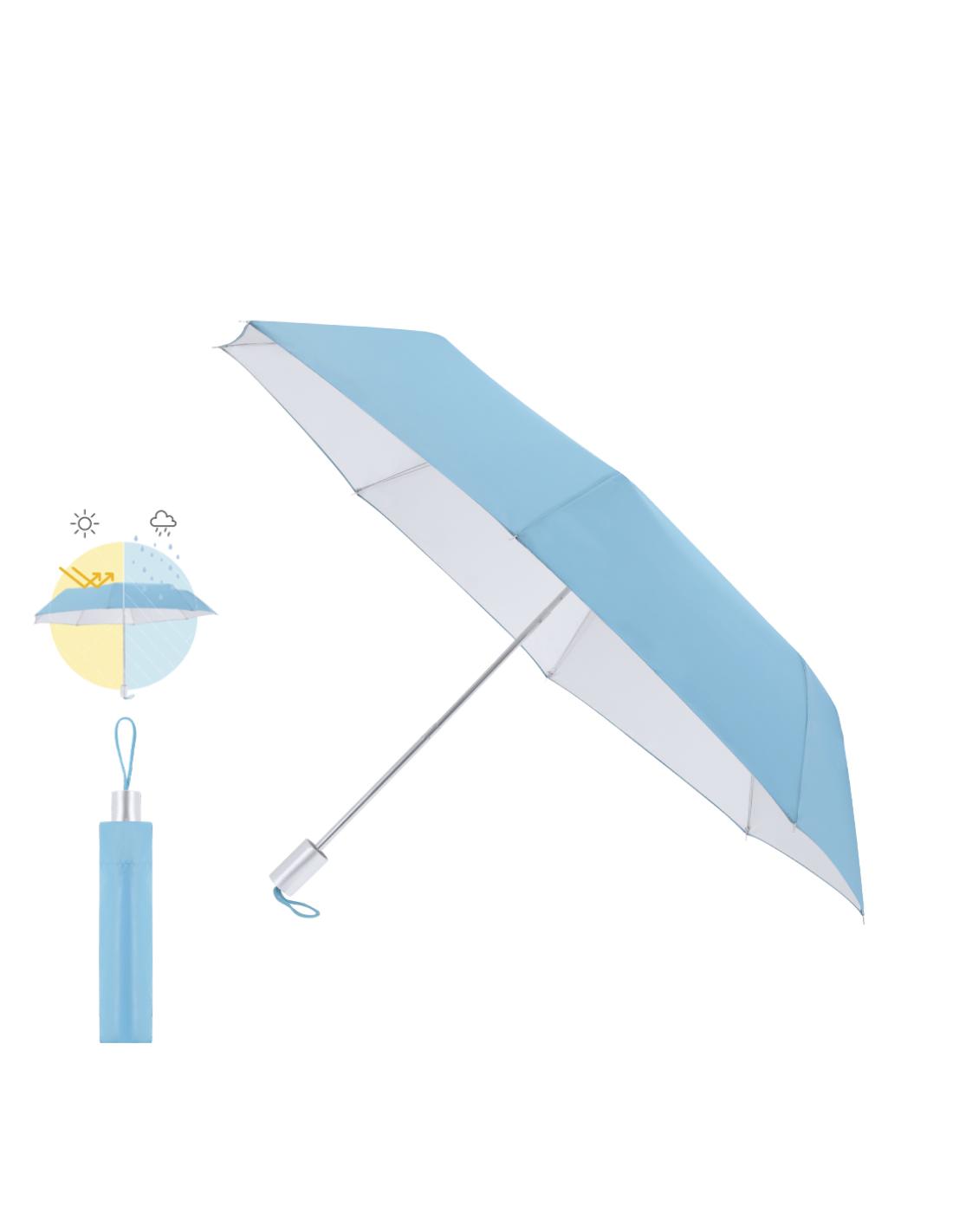 Paraguas plegable de 96 cm de diámetro, ideal para protegerte de la lluvia y los rayos solares gracias a su tejido de poliéster 190T con protección solar UPF50+.Cuenta con apertura y cierre manual, varillas metálicas para mayor resistencia y mango de acabado mate. Su sistema de protección solar UPF50+, bloquea hasta el 98% de los rayos UV, proporcionando una barrera eficaz contra los daños solares y garantizando la seguridad de tu piel durante exposiciones prolongadas.