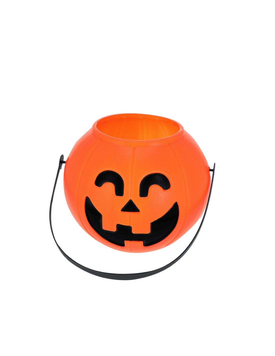 Cesta temática de Halloween con diseño en forma de calabaza. Incluye un asa que garantiza un agarre cómodo.