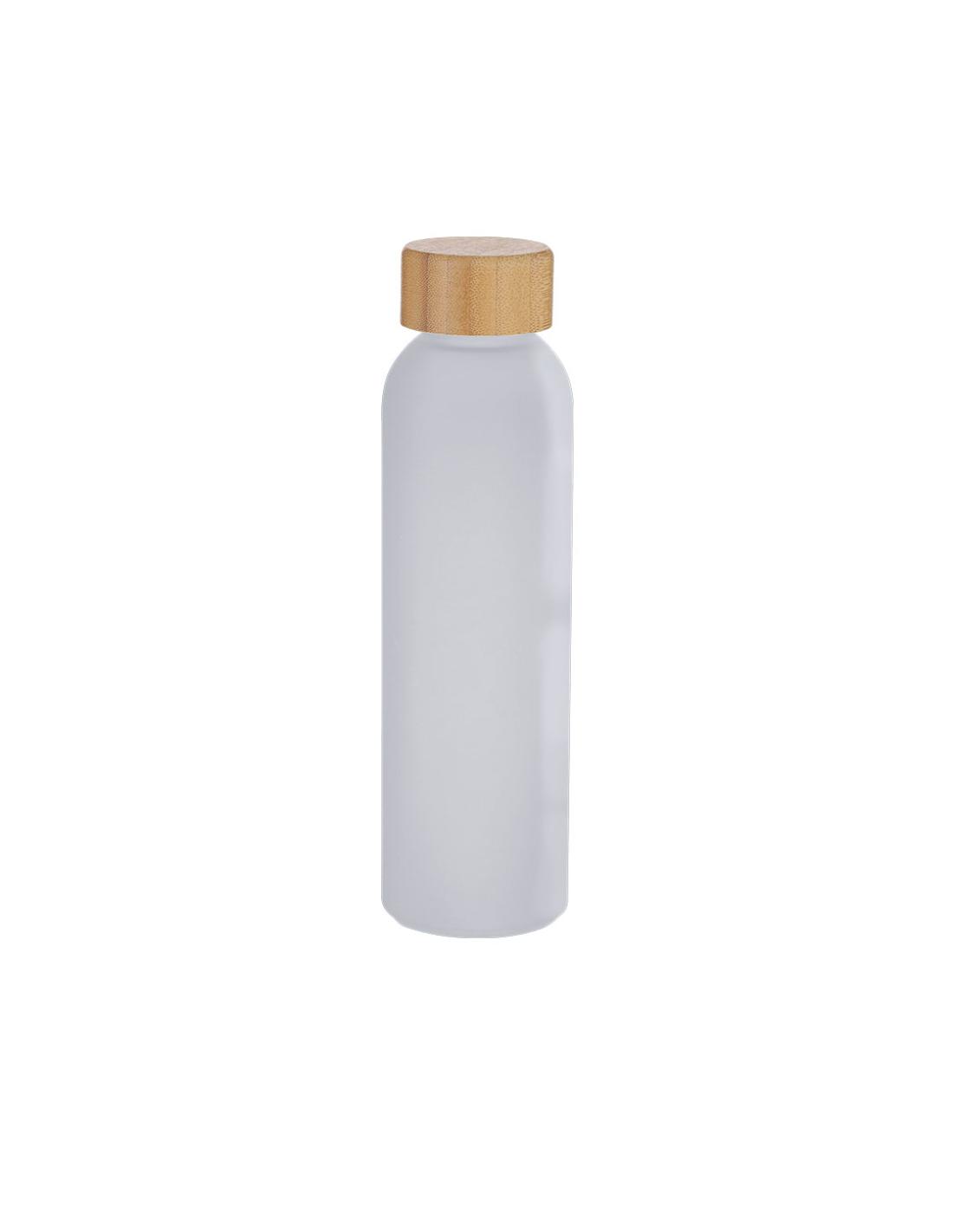 Bidón en Cristal Reciclado, acabado frosted, de 500 ml de capacidad y tapón en bambú. Incluye distintivo de Recycled Glass.