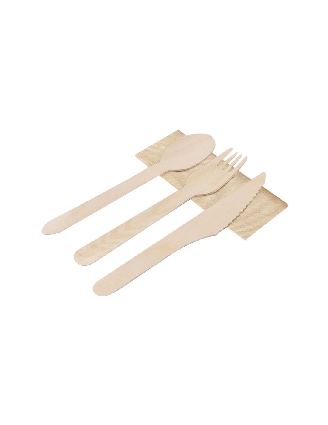 Set de cubiertos ecológicos 4 en 1 de madera natural con servilleta. Incluye: cuchara, tenedor, cuchillo y servilleta de papel en color kraft. Presentado en bolsa individual.Elaborado con elementos vegetales para así fomentar la utilización de materias primas naturales y reducir las emisiones contaminantes.