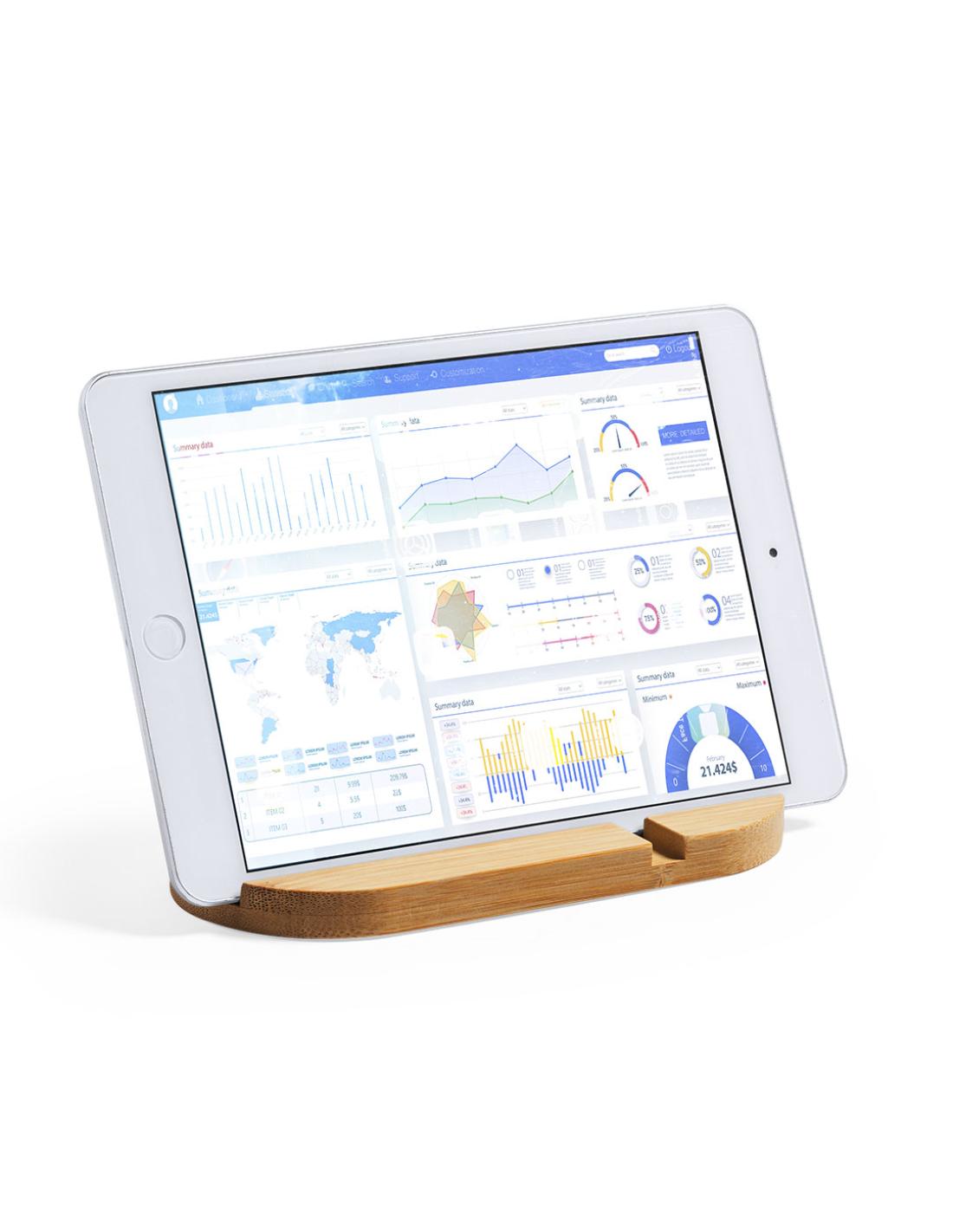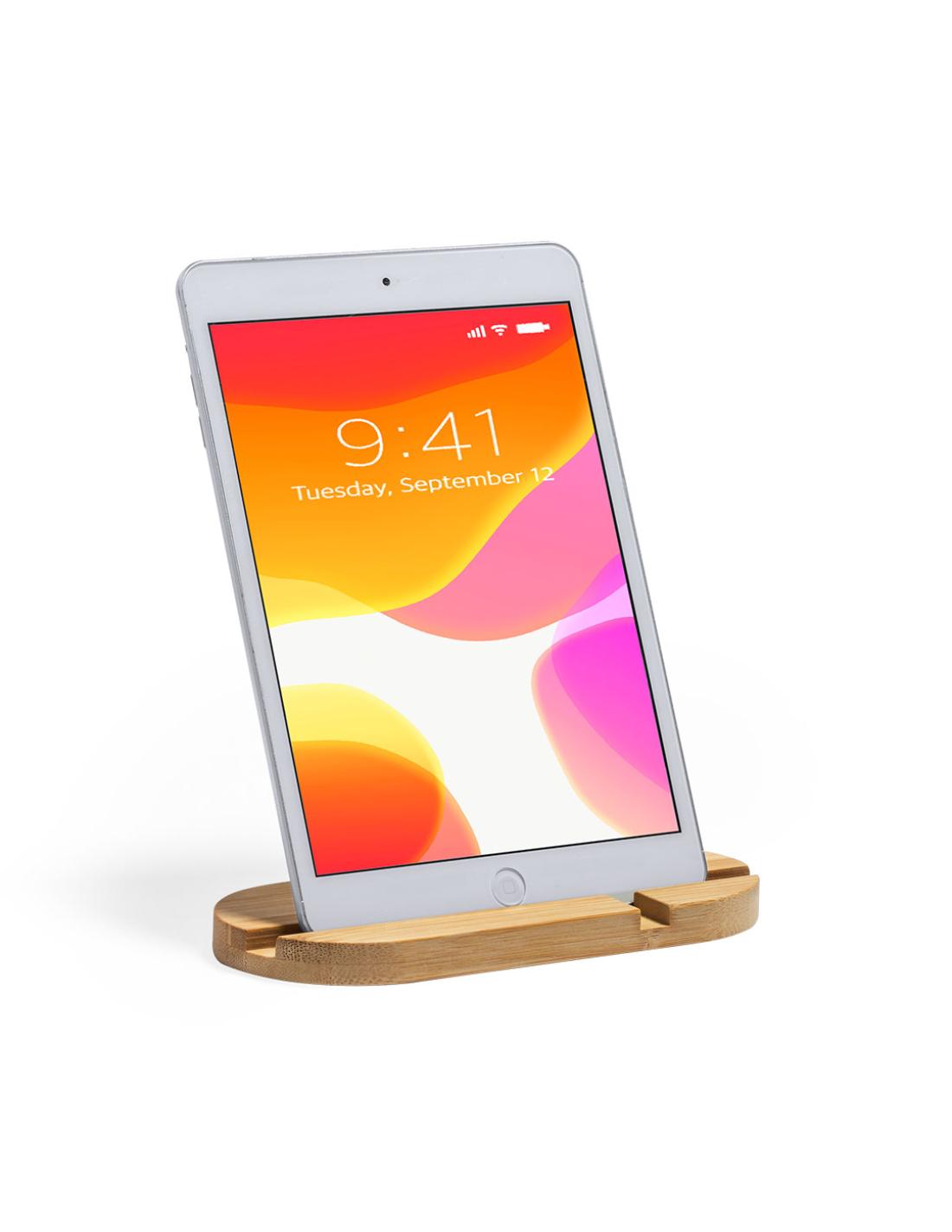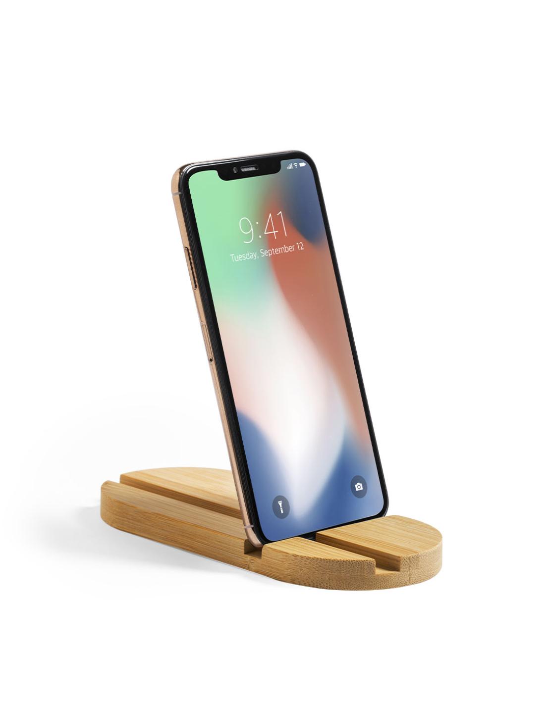 Original y sencillo soporte de línea nature para smartphone y tablet. Fabricado en bambú procedente de cortes naturales. Presentado en atractiva caja individual de diseño eco.