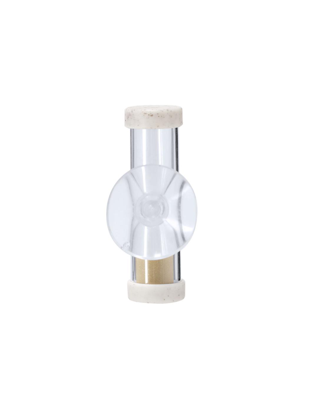 Reloj de arena con duración 2 minutos, fabricado en combinación caña de trigo y cristal. Cuenta con una práctica ventosa que permite fijarlo fácilmente.La Caña de Trigo fomenta la utilización de materias primas naturales, reduciendo así las emisiones contaminantes.