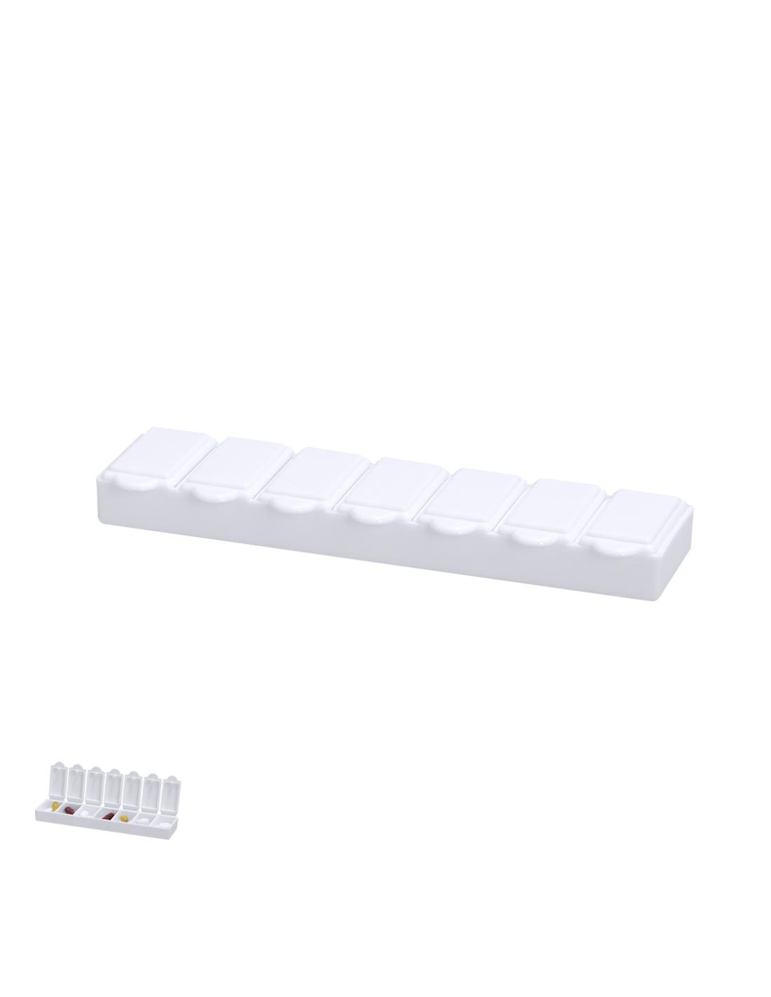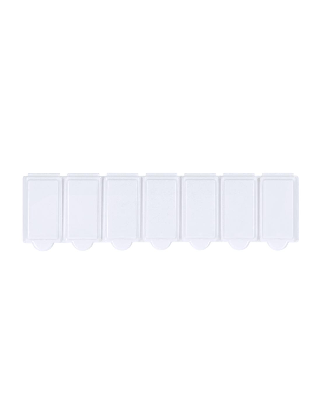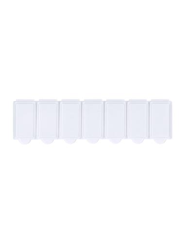 Pastillero semanal en resistente material PP de acabado blanco sólido. Incluye 7 compartimentos individuales con cierre de seguridad. Libre de BPA.
