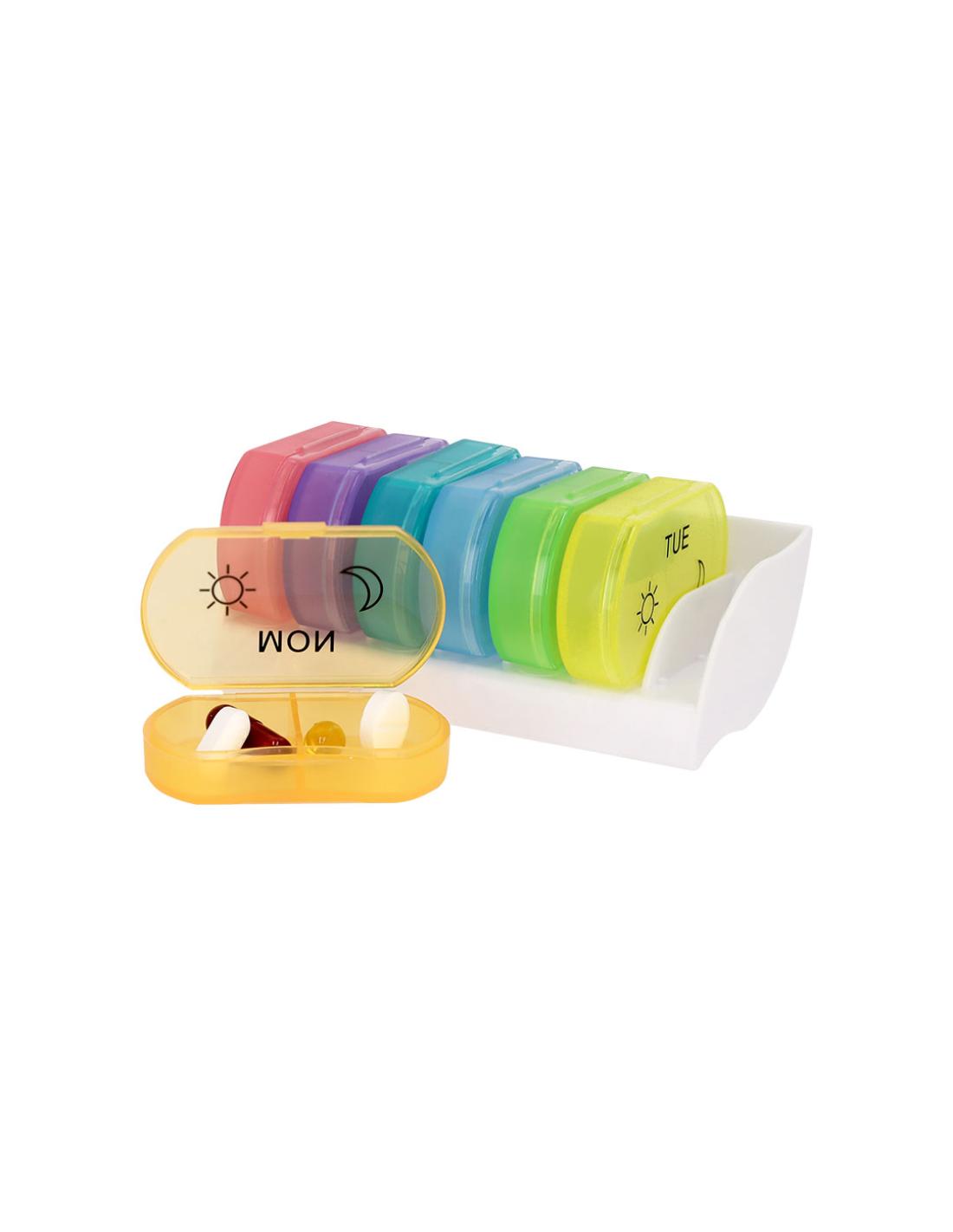 Pastillero semanal en resistente PP. Incluye 7 compartimentos individuales, cada uno identificado por un color y las siglas correspondientes al día de la semana, facilitando su uso. Cada compartimento está dividido en 2 casillas independientes, ideales para separar las dosis de la mañana, la tarde o noche.