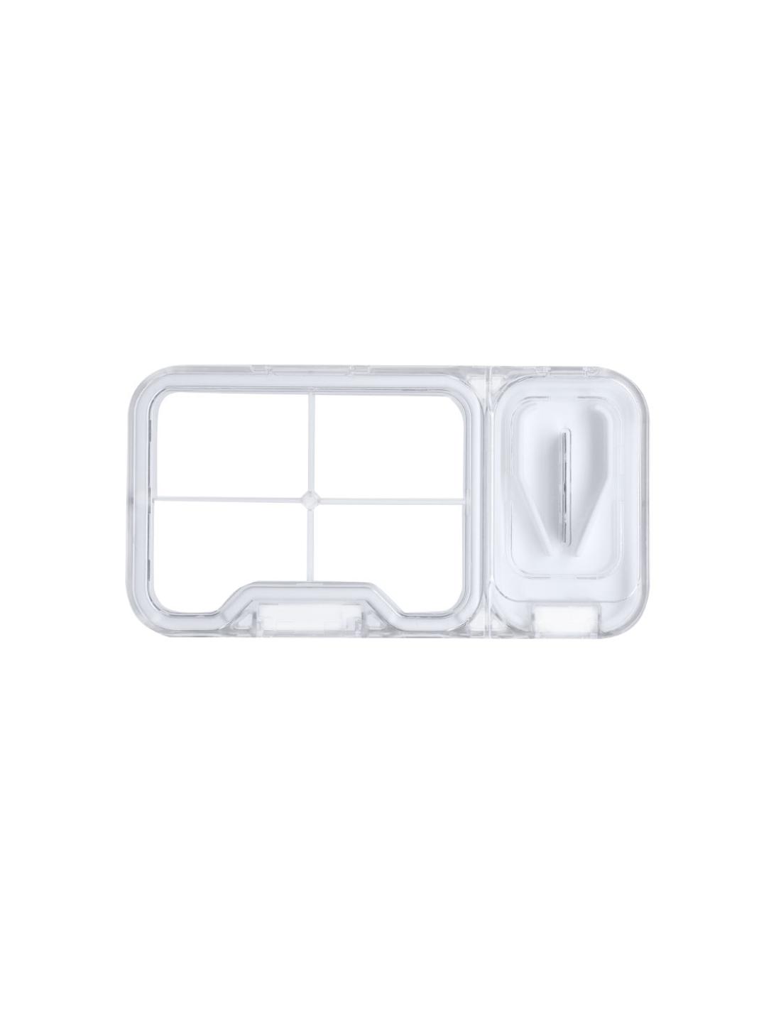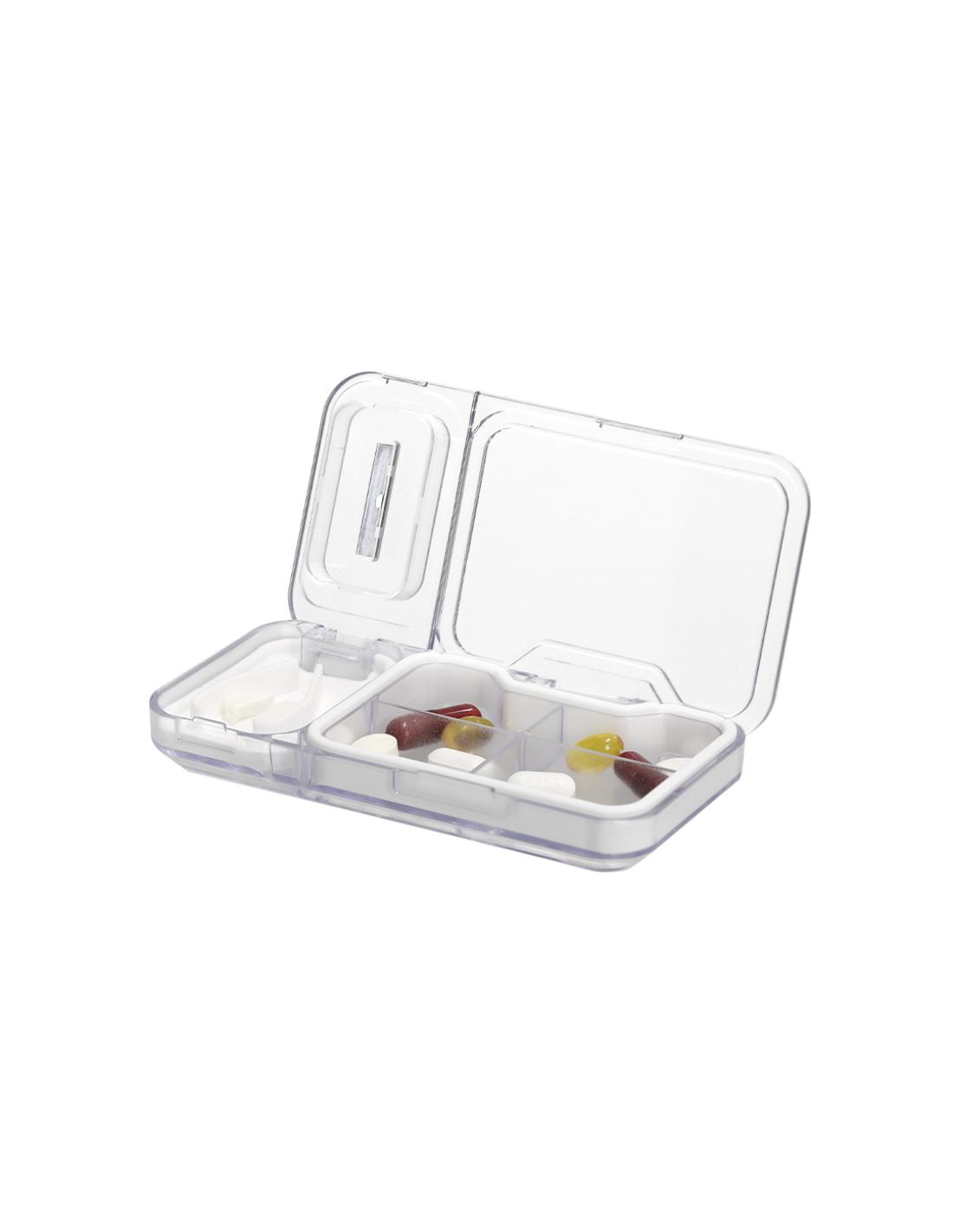 Pastillero con 4 compartimentos interiores, cierre de seguridad con bordes de silicona y cuchilla para partir pastillas. Fabricado con un acabado transparente.