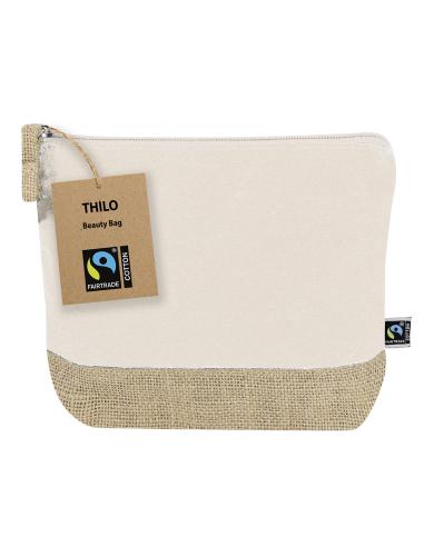Neceser fabricado en combinación de algodón y yute laminado con certificación Fairtrade (Comercio Justo), un sistema comercial solidario y alternativo al convencional que persigue el desarrollo de los pueblos y la lucha contra la pobreza.Incluye compartimento principal con cierre de cremallera y tirador metálico, con base en tono natural yute y se complementa con una parte frontal superior en algodón en colores. Con práctico cordón para agarre. Incluida etiqueta Fairtrade y etiqueta con logotipo en cartón reciclado.