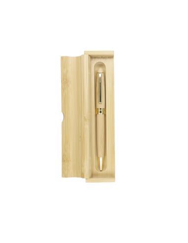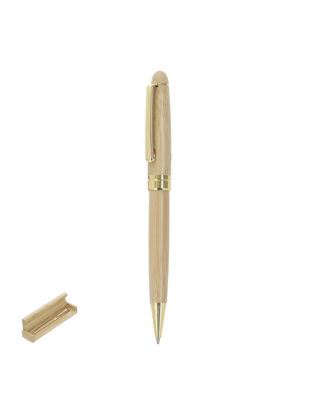 Elegante bolígrafo elaborado en una combinación de bambú natural y elementos metálicos con acabado dorado, con mecanismo giratorio y tinta azul. Presentado en distinguido estuche de bambú.Materiales como el Bambú fomentan la utilización de materias primas naturales reduciendo las emisiones contaminantes. Además, el bambú proviene de una planta de gran resistencia y versatilidad, con crecimiento y regeneración rápida, siendo una excelente alternativa al uso de madera tradicional.