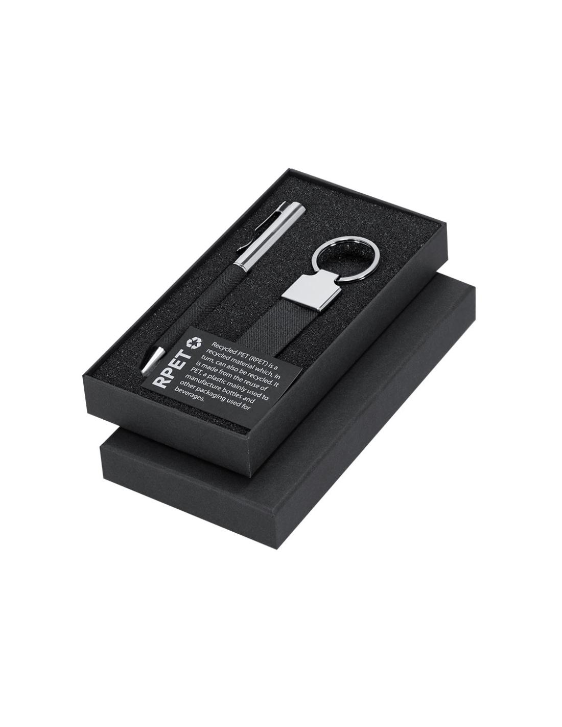 Elegante set en RPET con acabado negro bitono y detalles metálicos. Incluye:-Bolígrafo de RPET de acabado negro bitono y detalles metálicos. Con mecanismo giratorio y tinta azul.-Llavero en RPET de acabado color negro bitono y accesorios cromados.Presentado en estuche individual negro. Incluye tarjeta negra interior con distintivo RPET.El material RPET se elabora a partir de plástico reciclado, para así fomentar la reutilización de residuos plásticos y ayudar a la sostenibilidad del planeta.