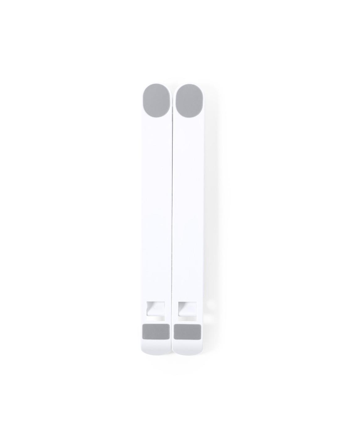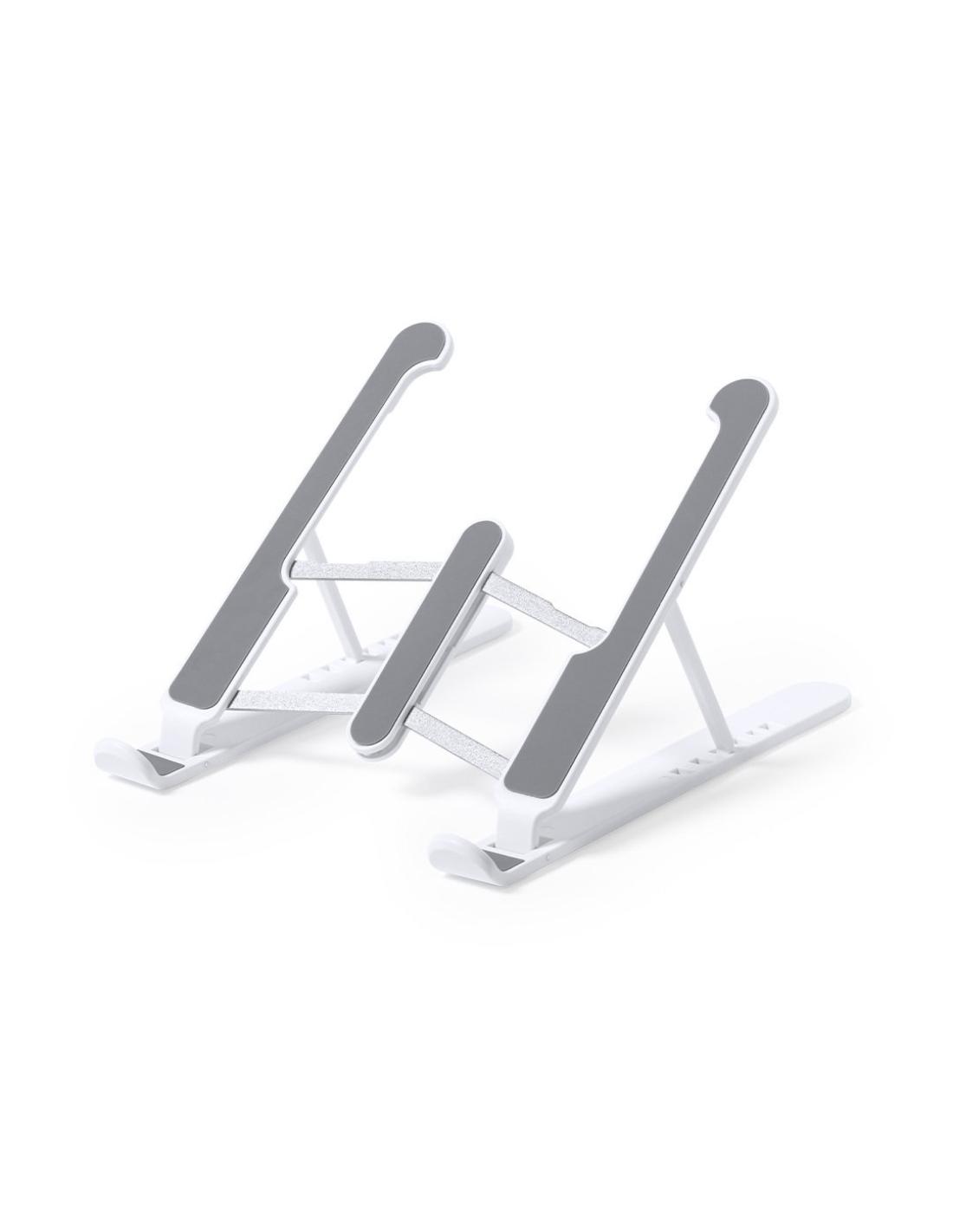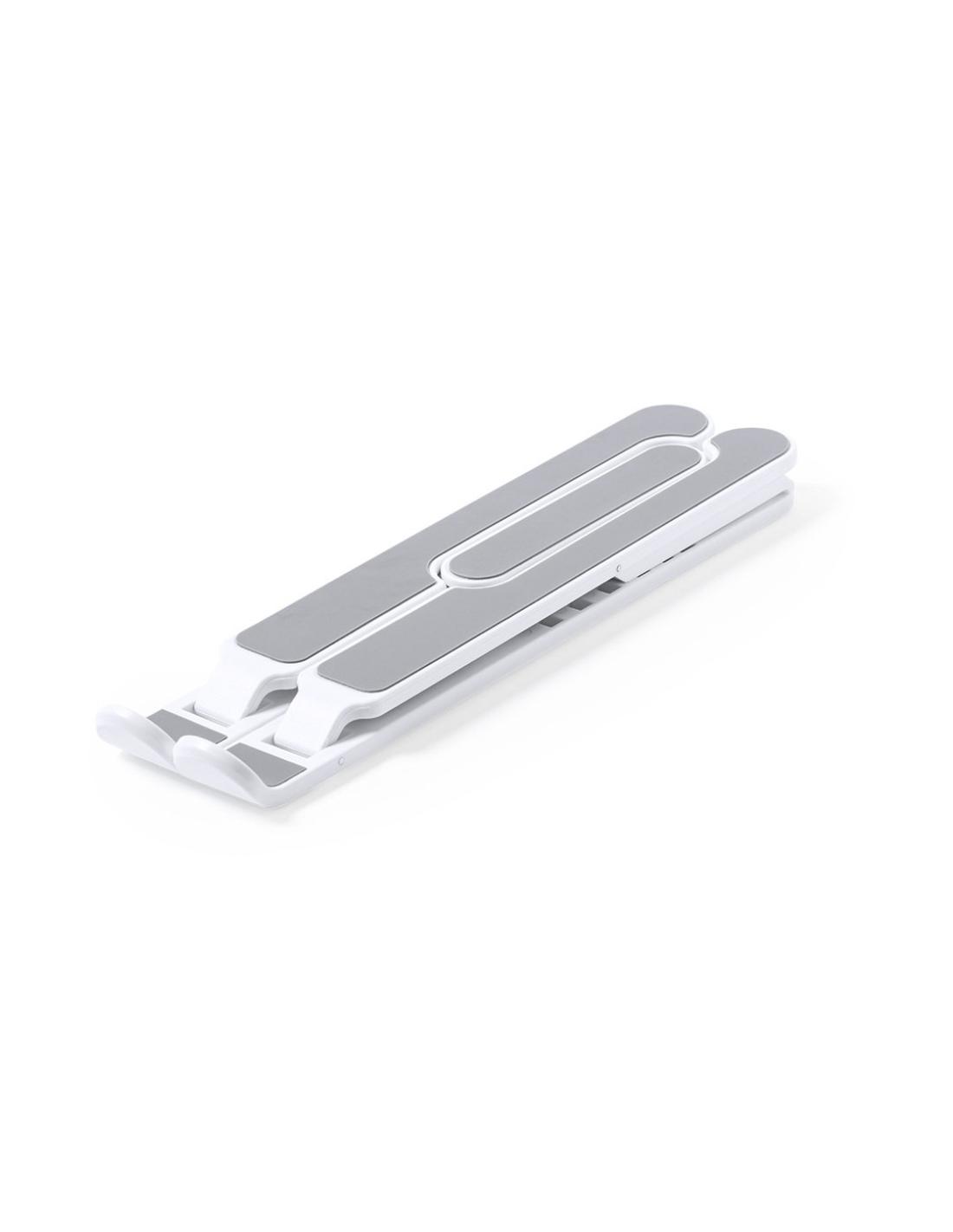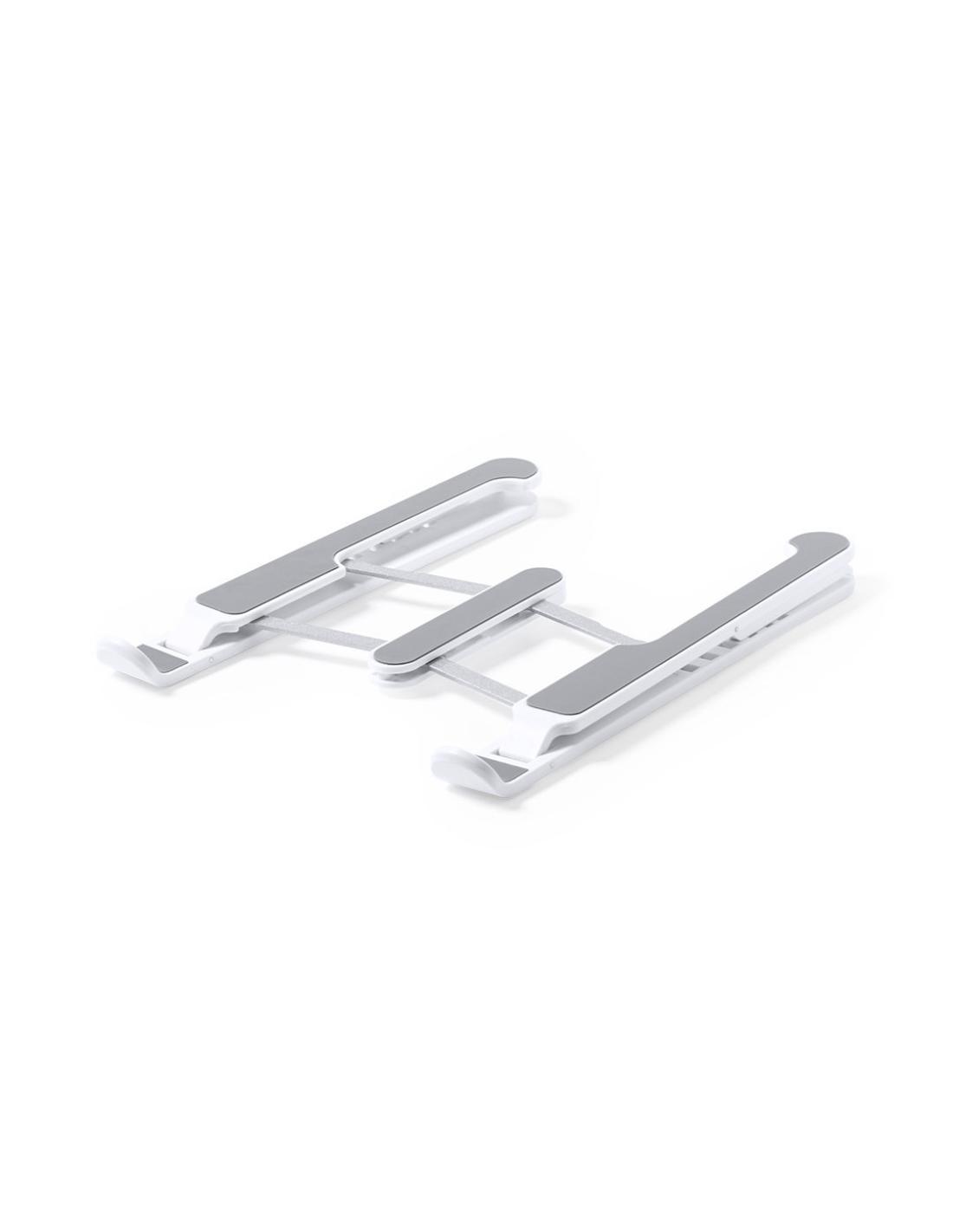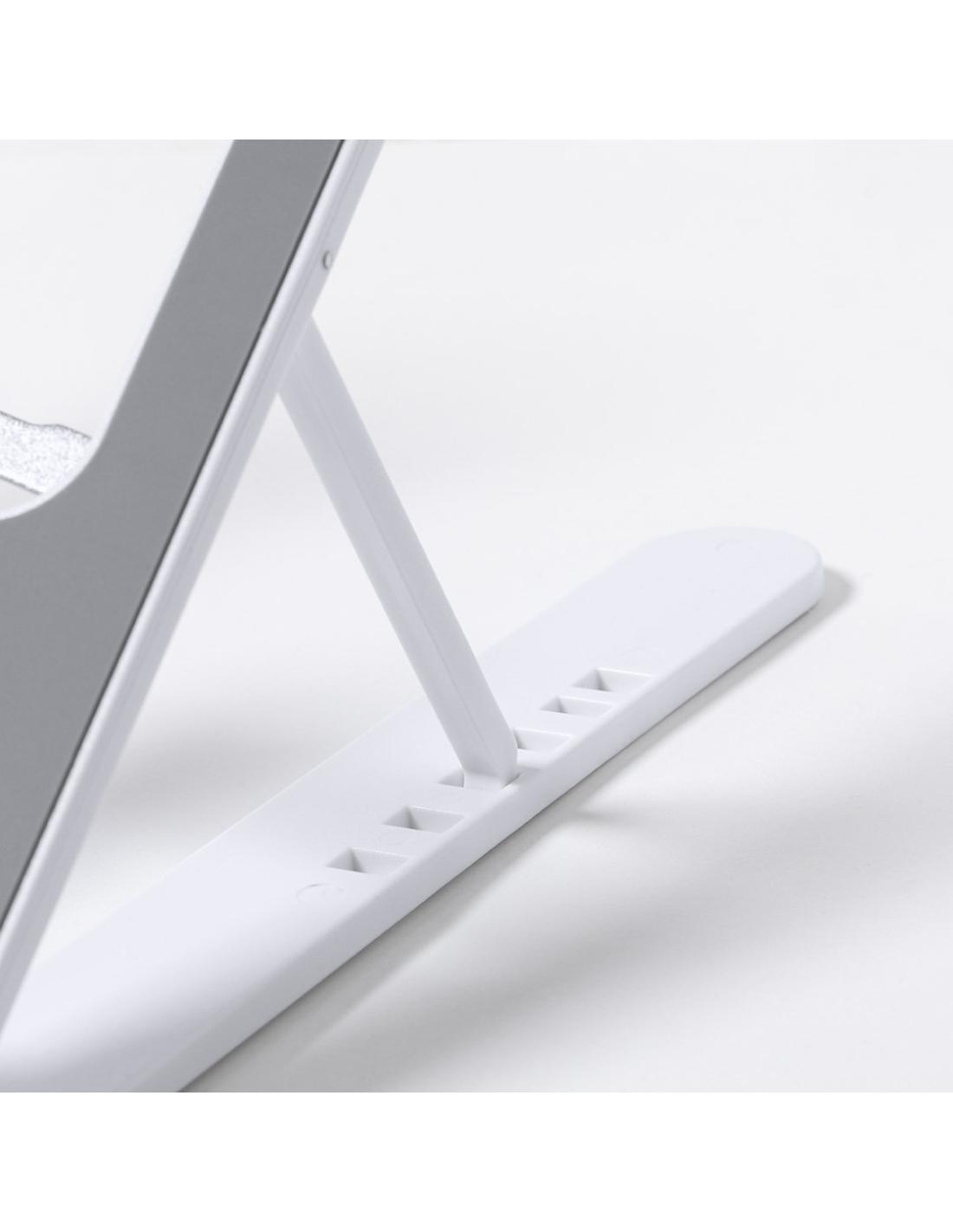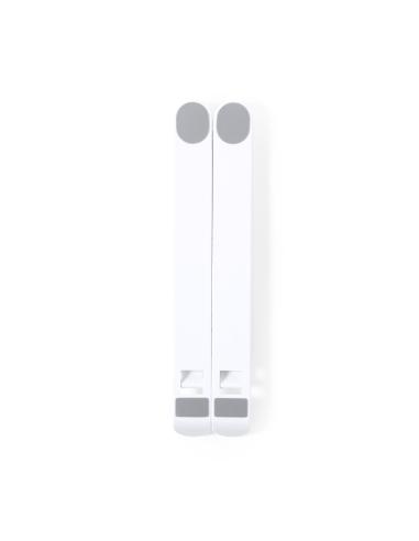 Soporte plegable para portátil. Fabricado en resistente ABS con protecciones antideslizantes en TPR para un firme ajuste al dispositivo. Regulable en altura, con plegado de tamaño compacto y presentado en funda de antelina con cierre de cordón y en caja individual de diseño.