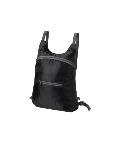 Mochila plegable en suave poliéster 201D RPET, elaborado a partir de plástico reciclado, para así fomentar la reutilización de residuos plásticos y ayudar a la sostenibilidad del planeta. Con cierre de cremallera y bolsillo frontal. Esquinas reforzadas, cintas de hombros regulables y accesorios en color gris. Plegado de pequeño tamaño, con cinta de transporte y disponible en variada gama de colores. Distintivo RPET en etiqueta.