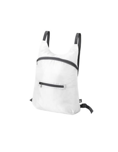 Mochila plegable en suave poliéster 201D RPET, elaborado a partir de plástico reciclado, para así fomentar la reutilización de residuos plásticos y ayudar a la sostenibilidad del planeta. Con cierre de cremallera y bolsillo frontal. Esquinas reforzadas, cintas de hombros regulables y accesorios en color gris. Plegado de pequeño tamaño, con cinta de transporte y disponible en variada gama de colores. Distintivo RPET en etiqueta.