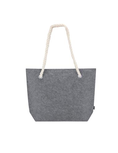 Bolsa fabricada en fieltro reciclado. Con asas de cordón en algodón reforzadas con argollas y fuelle. Resistencia hasta 6kg. Distintivo RPET en etiqueta exterior.El material RPET se elabora a partir de plástico reciclado, para así fomentar la reutilización de residuos plásticos y ayudar a la sostenibilidad del planeta.