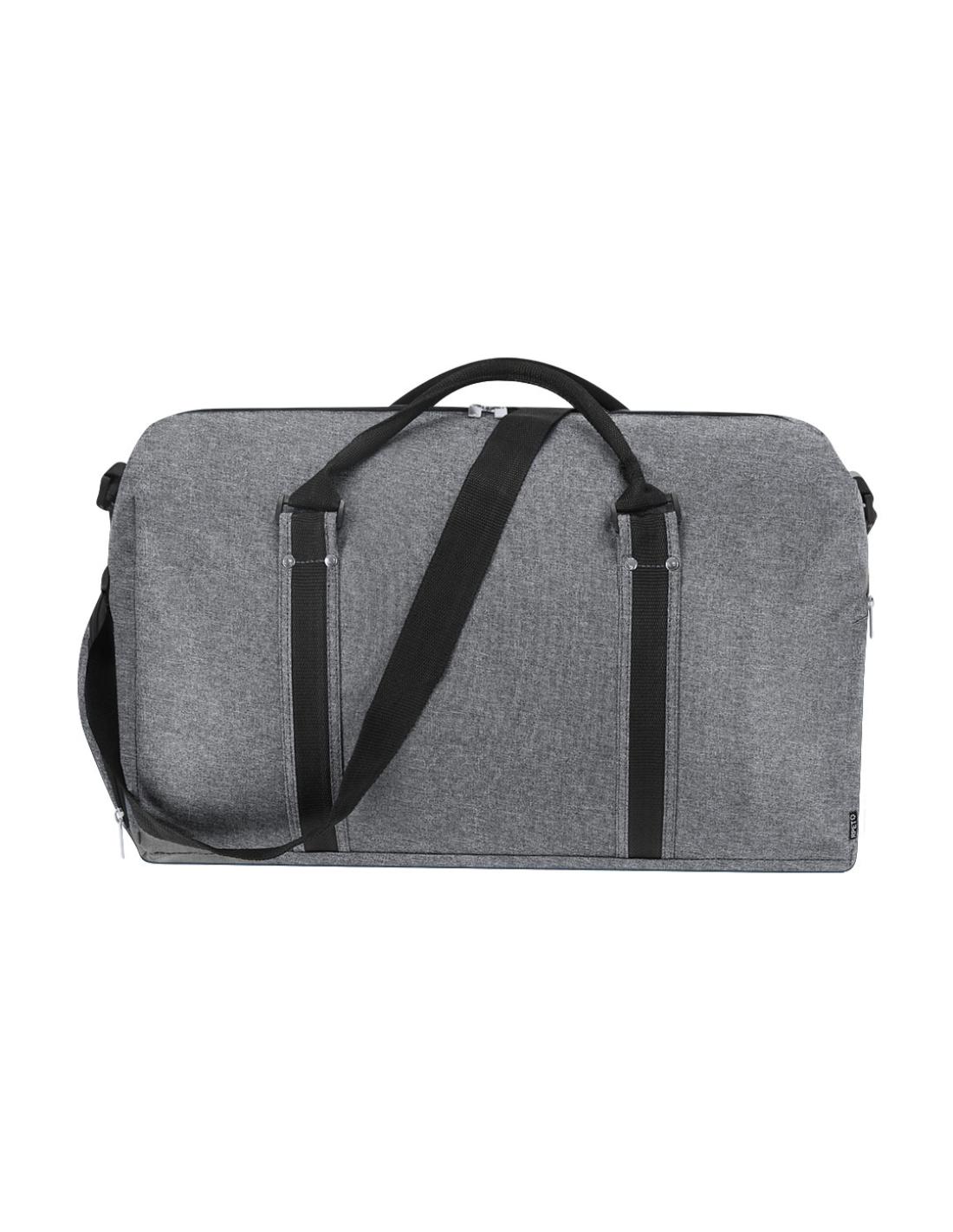 Bolso confeccionado en poliéster RPET 600D. Presenta tres compartimentos funcionales: un compartimento principal de gran capacidad con cierre de cremallera, un bolsillo lateral con cierre de cremallera y un bolsillo en la base con cierre de doble cremallera ideal para el calzado. Incluye asa larga ajustable, asas de mano reforzadas con tachuelas metálicas y con elegantes detalles en plateado. El material RPET se elabora a partir de plástico reciclado, para así fomentar la reutilización de residuos plásticos y ayudar a la sostenibilidad del planeta.