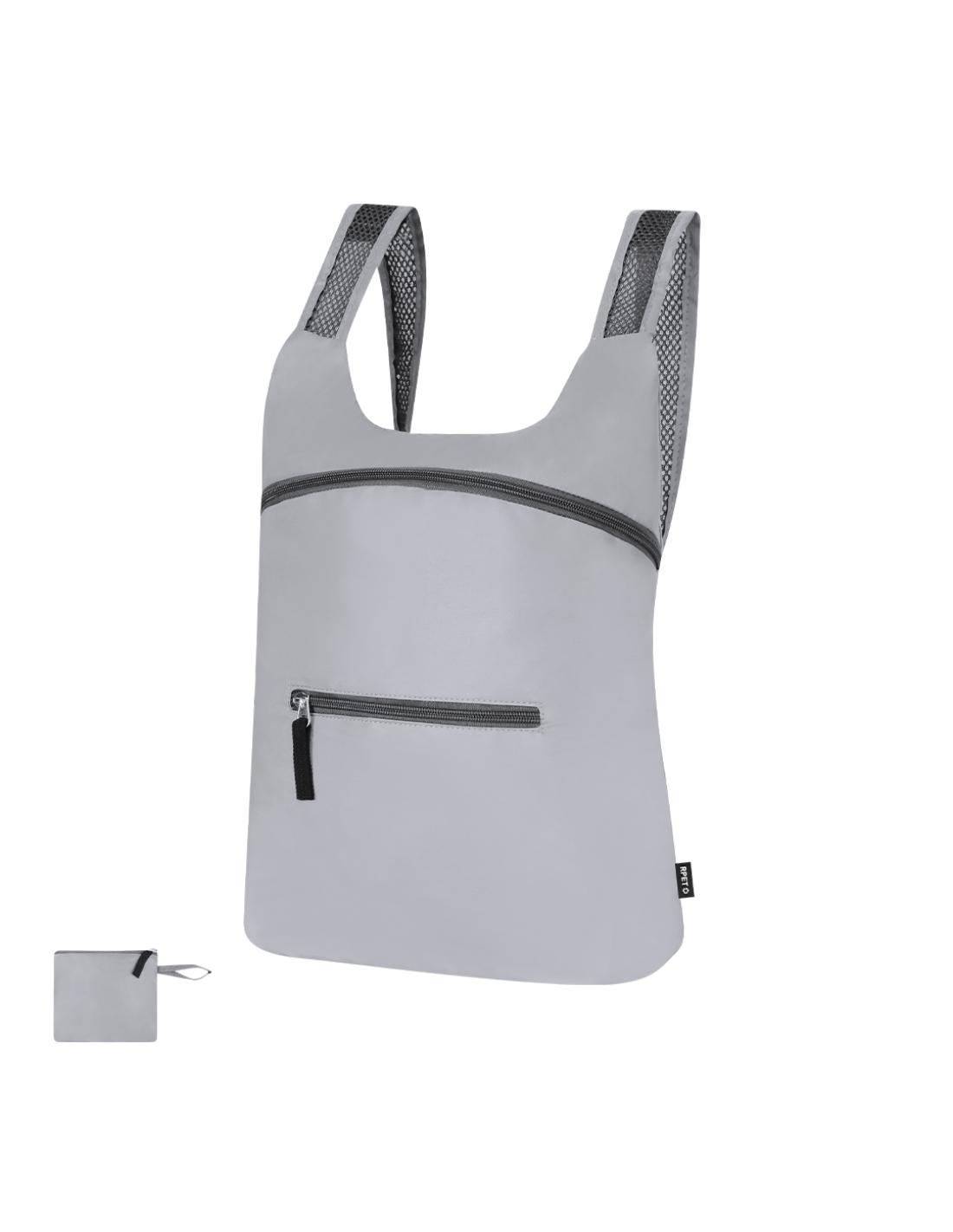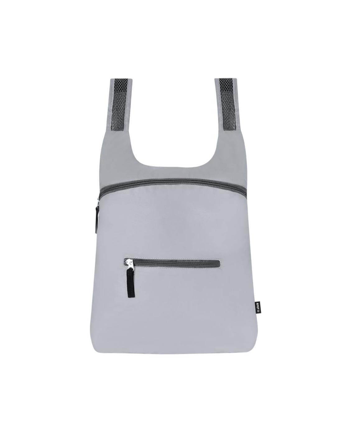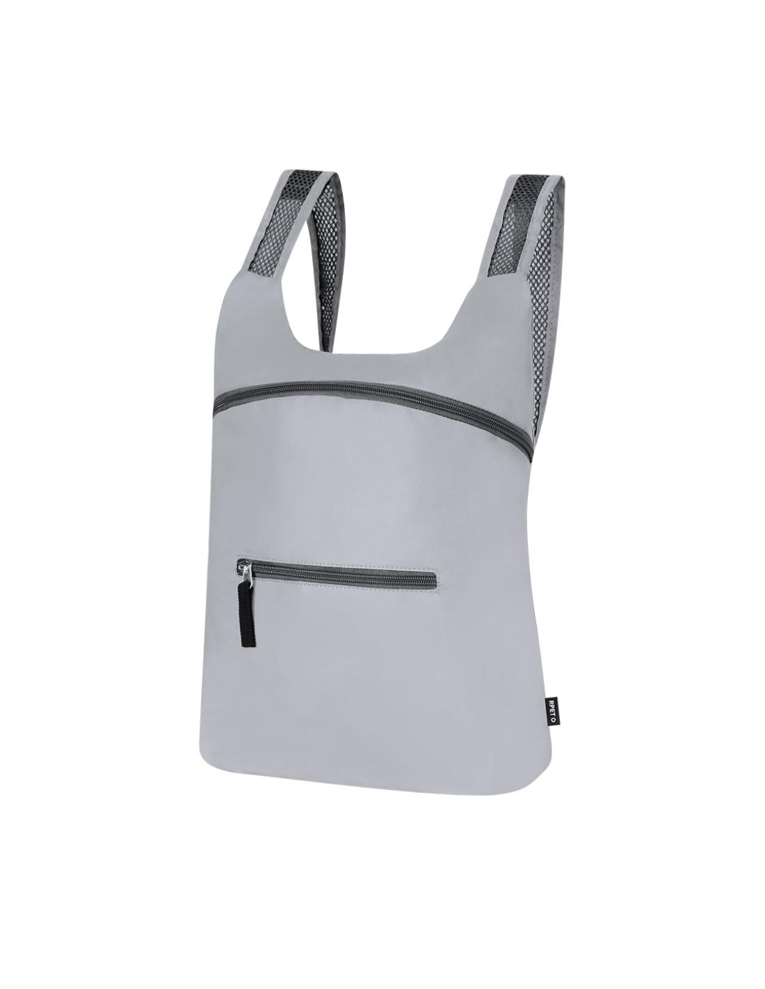 Mochila plegable de RPET. CFabricada empleando tejido con gran capacidad para reflejar intensamente la luz, gracias a millones de pigmentos reflectantes y basándose en el principio de la retro-reflexión de la luz, una propiedad de visibilidad nocturna que consiste en la refracción de la luz hacia la fuente de origen de la misma. Con cierre de cremallera y bolsillo frontal. Cintas de hombros regulables en material transpirable. Plegado de pequeño tamaño, con cinta de transporte. Incluye distintivo RPET.El material RPET se elabora a partir de plástico reciclado, para así fomentar la reutilización de residuos plásticos y ayudar a la sostenibilidad del planeta.