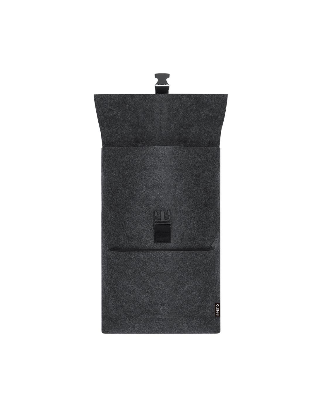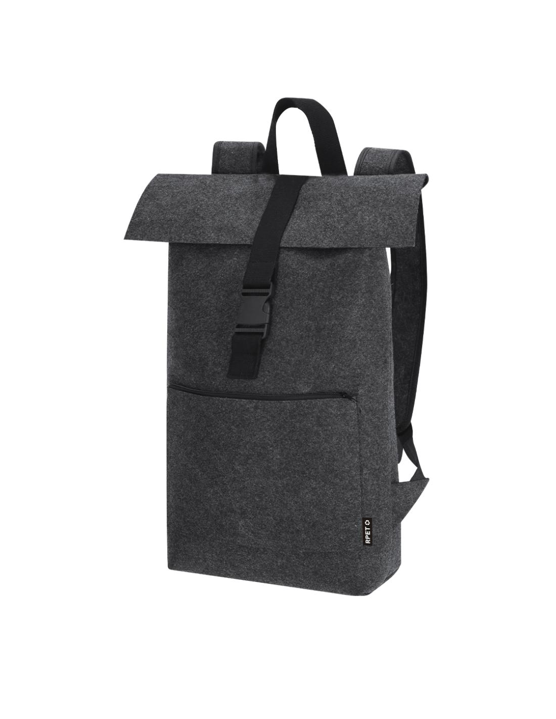 Mochila de fieltro RPET. Cuenta con bolsillo principal con cierre de hebilla y bolsillo frontal adicional con cierre de cremallera. Equipada con cintas para los hombros ajustables y reforzadas y asa superior. Incluye distintivo RPET en etiqueta exterior.El fieltro RPET es fruto de la combinación del proceso de reciclaje de materiales plásticos junto con la técnica milenaria de fabricación del fieltro, dando como resultado un material de eco-tendencia que, además de ser de origen reciclado, también se convierte en reciclable.