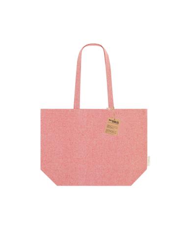 Bolsa confeccionada principalmente en algodón reciclado de 220 g/m2 con fuelle. Asas largas de 70cm con refuerzo, de acabado cosido. Logotipo en etiqueta lateral y resistencia hasta 6 kg de peso.