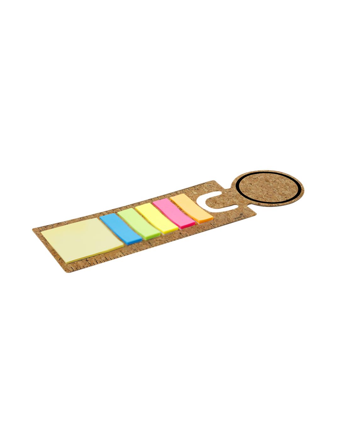 Regla marcapáginas de corcho con notas adhesivas. Incluye 90 notas adhesivas en variados colores y tamaños.Elaborado con elementos vegetales para así fomentar la utilización de materias primas naturales y reducir las emisiones contaminantes.