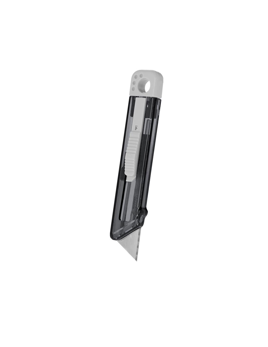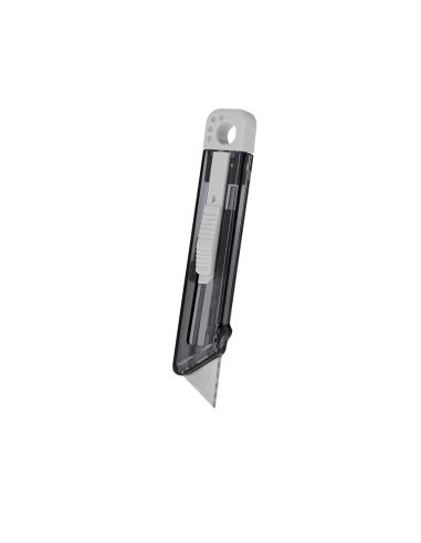 Cúter en PS de acabado translúcido. Con un mecanismo pulsador de retracción automática y una hoja de acero de 6 x 1,9 cm, sin sistema de bloqueo (stopper).