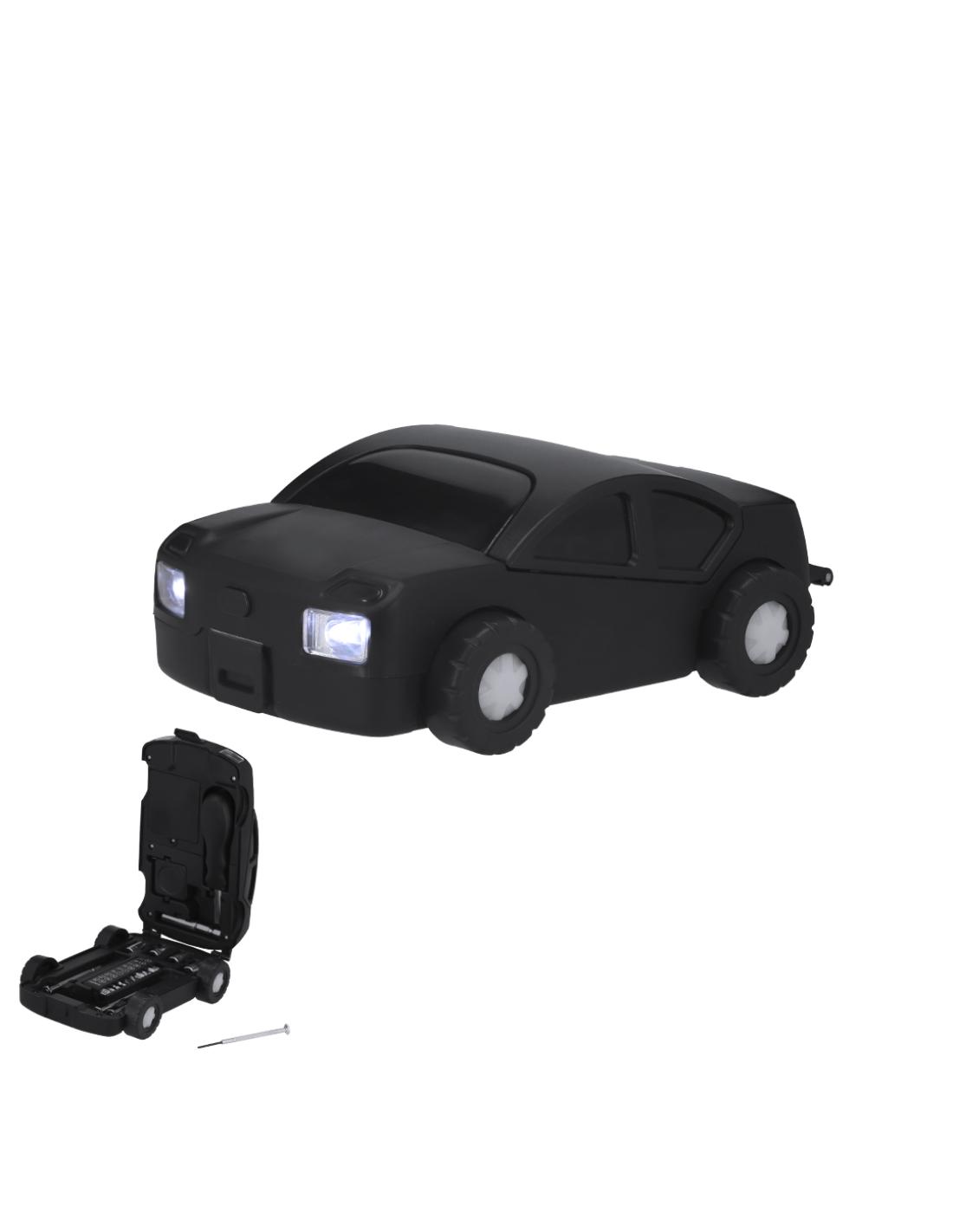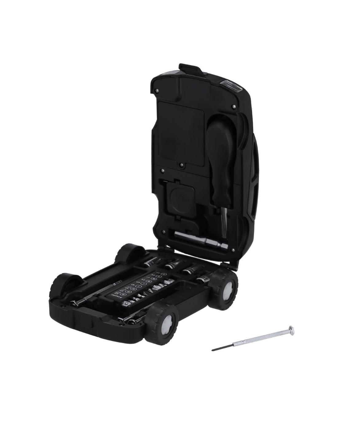 Set de herramientas con estuche en forma de coche y linterna LED. Con 20 herramientas. Incluye: - Set de destornilladores de precisión (planos y philips)- Herramienta de fijación- Mango multifunción con cabezales de destornilladores planos y de estrella-Llaves para tuercas de cabeza hexagonal-FlexómetroCon linterna con 2 LEDs integrada en el escuche, alimentada por 4 pilas AAA (no incluidas).