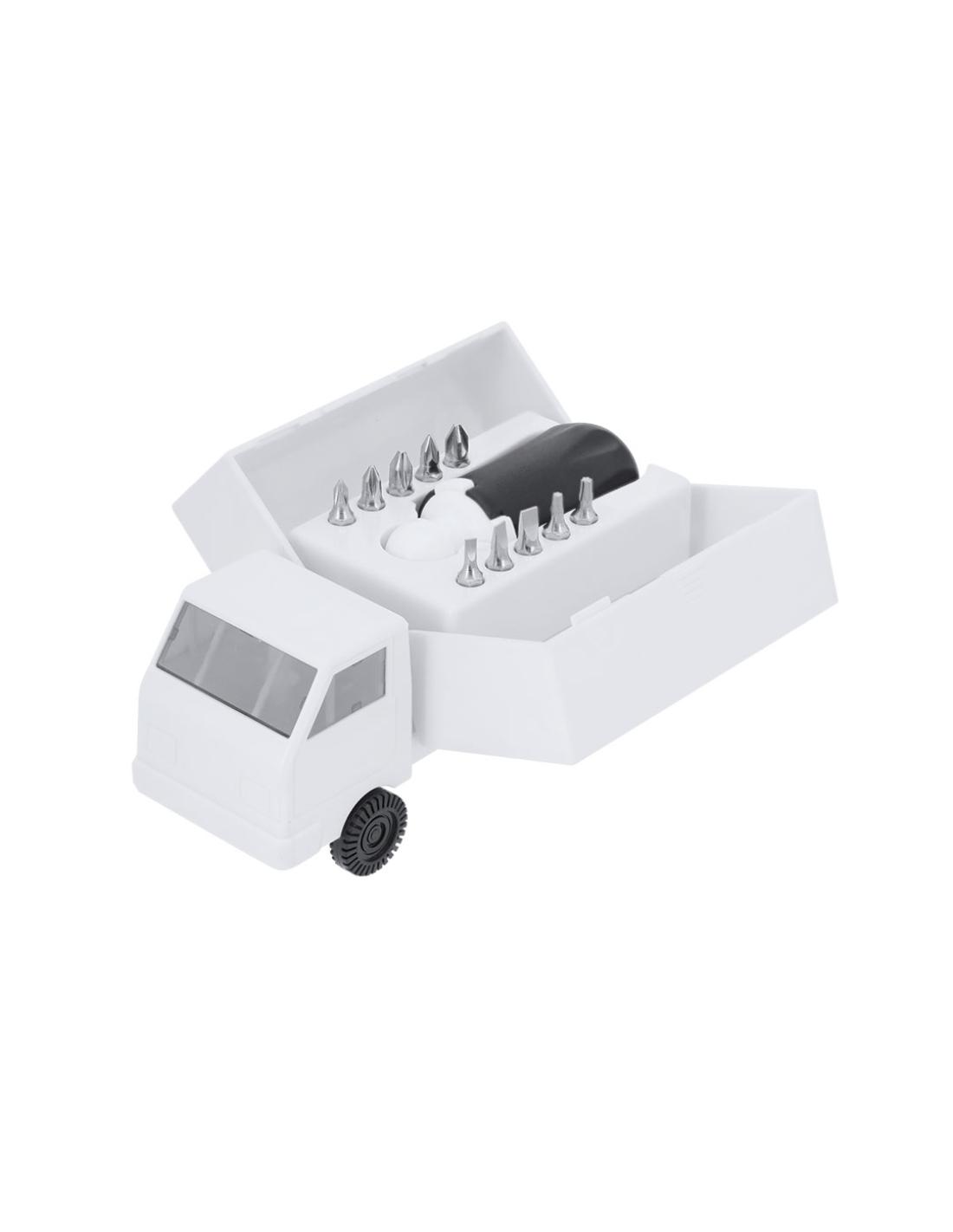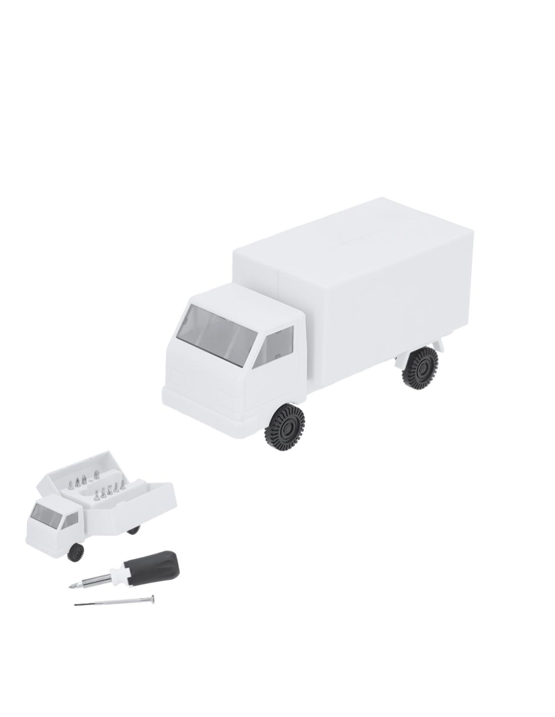Set de herramientas con estuche en forma de camión. Con 15 herramientas. Incluye set de destornilladores de precisión (plano y philips) y mango multifunción con cabezales intercambiables planos y de estrella.