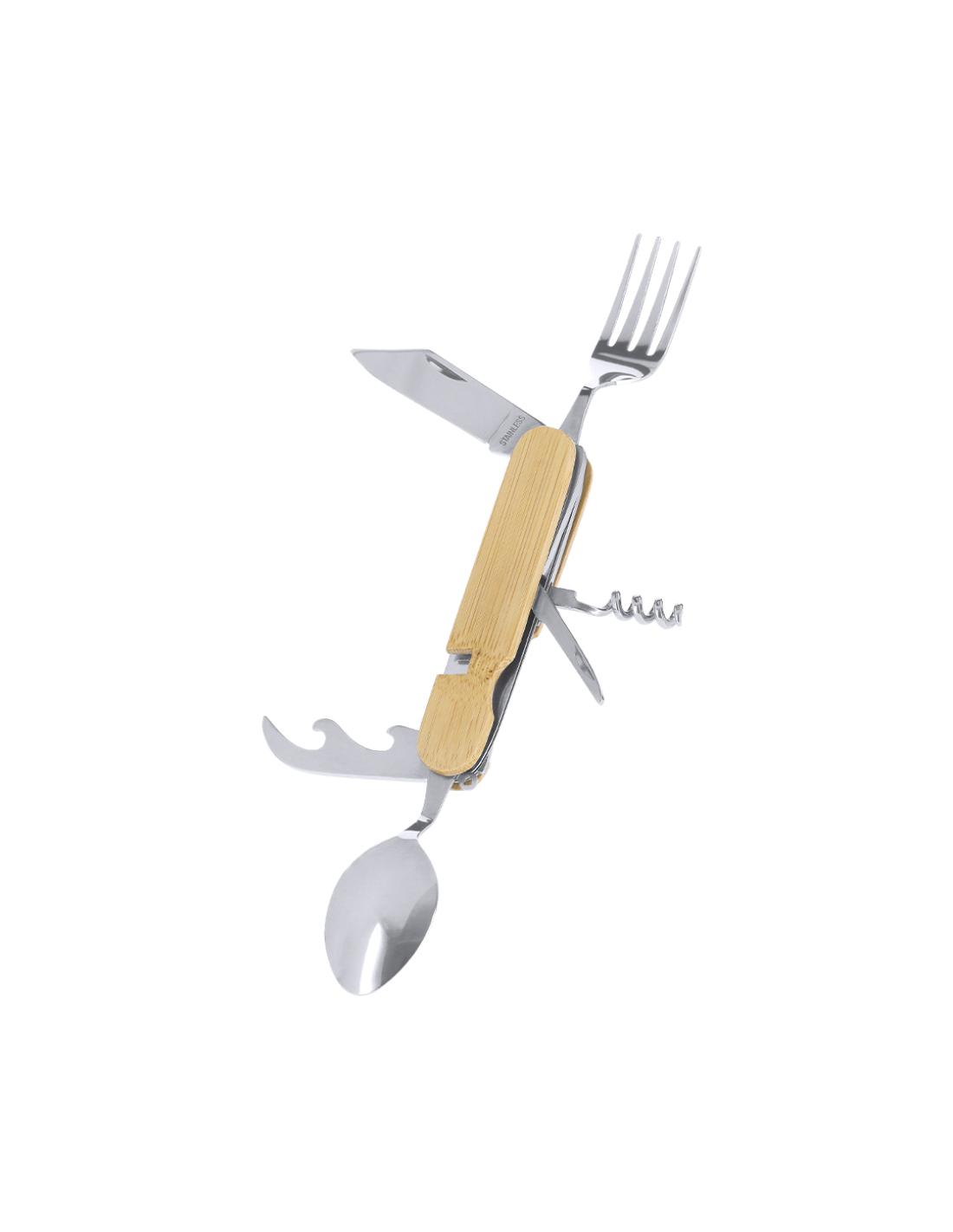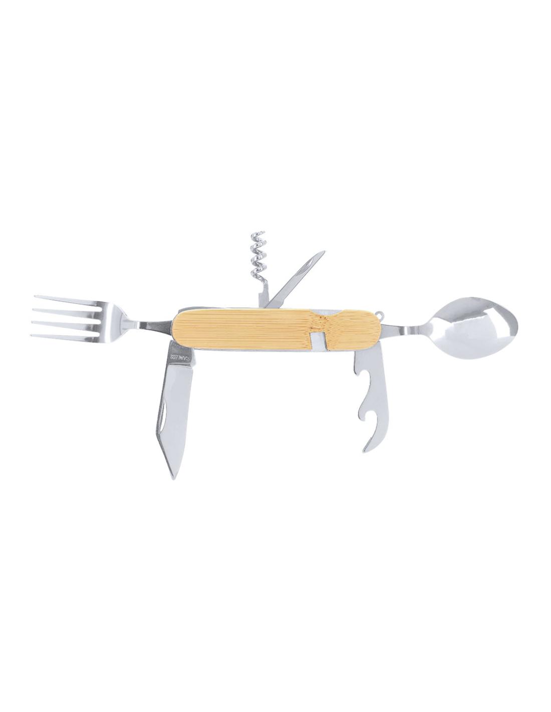 Set de cubiertos multifuncional fabricado en acero inoxidable y bambú. Incluye 7 funciones: cuchara, tenedor, cuchillo, abrebotellas, abrelatas, sacacorchos y punzón.Materiales como el Bambú fomentan la utilización de materias primas naturales reduciendo las emisiones contaminantes. Además, el bambú proviene de una planta de gran resistencia y versatilidad, con crecimiento y regeneración rápida, siendo una excelente alternativa al uso de madera tradicional.
