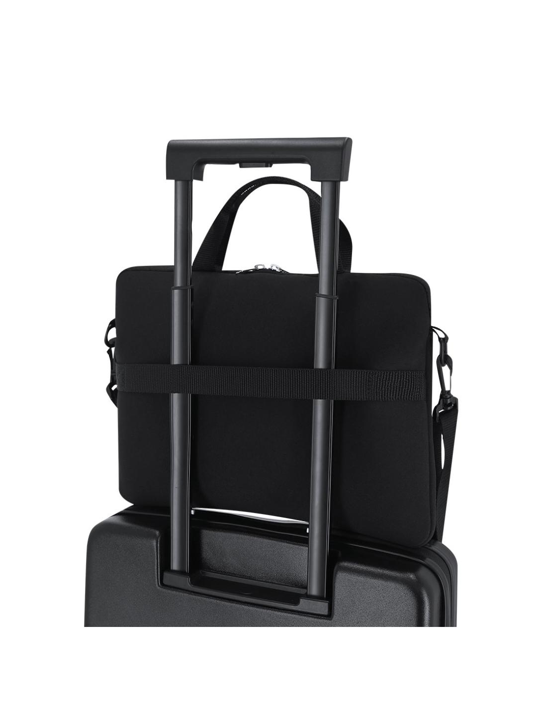 Funda para ordenador portátil confeccionada en soft shell, con compartimento principal acolchado para dispositivos de hasta 14 pulgadas. Diseñada con cierre de cremallera de doble tirador y un práctico bolsillo exterior de acceso rápido. Fácil de transportar gracias a sus asas de mano, cinta para hombro ajustable y cinta trasera para trolley.