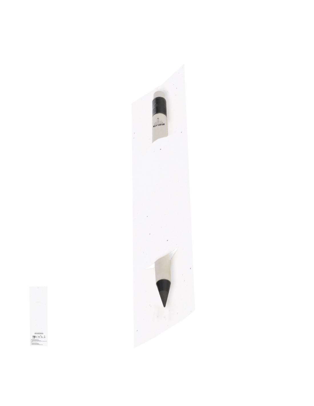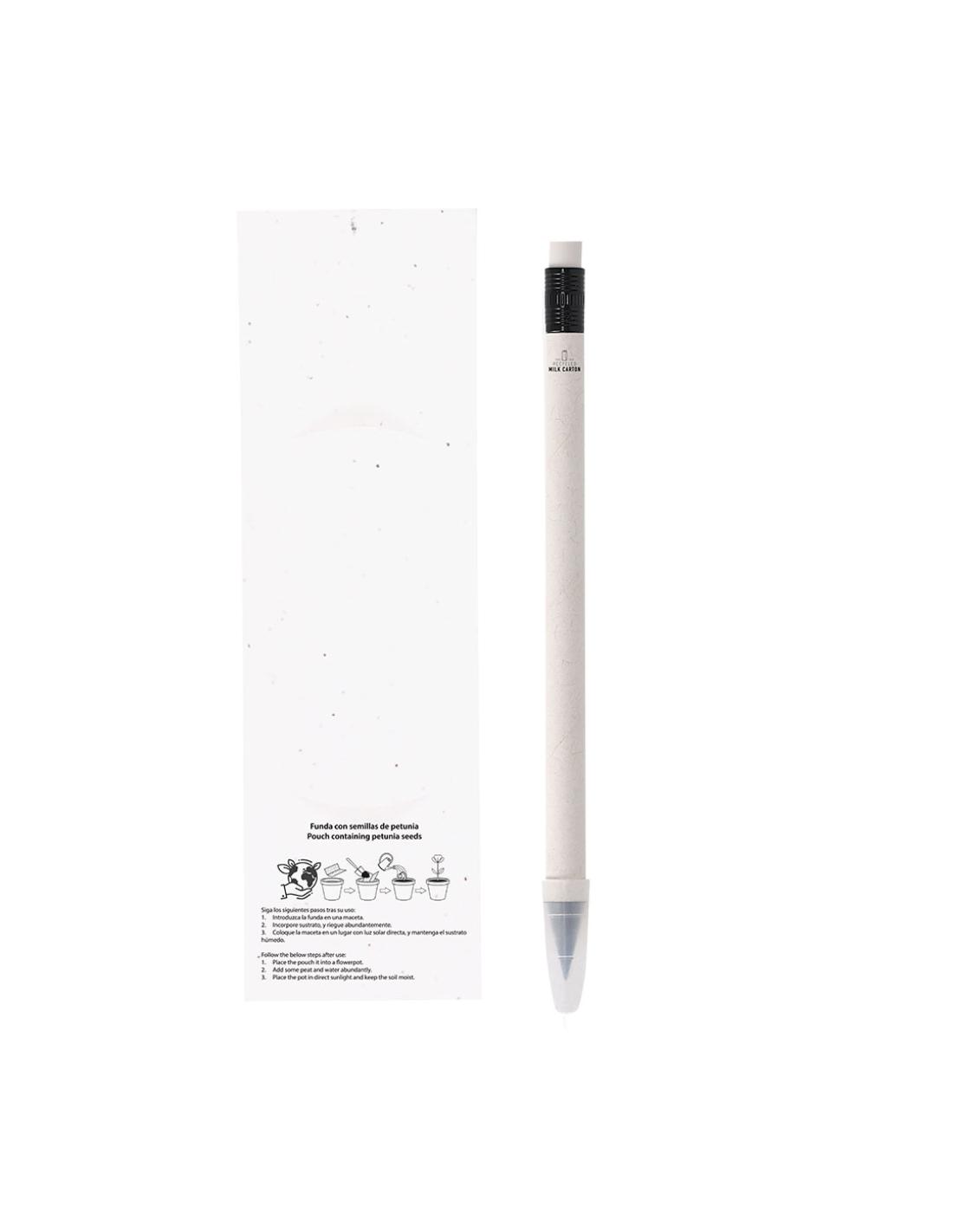Lápiz eterno fabricado con cartones de leche reciclados, presentado en funda de papel con semillas. Reutilizable y con escritura infinita. Incluye goma de borrar en la parte superior del lápiz y capucha de protección. De color blanco, con detalles en negro. Con distintivo de cartón de leche reciclado en el cuerpo. La funda incluye semillas de petunia, convirtiéndolo en papel plantable al final de su vida útil. Incluye instrucciones de plantado en la cubierta trasera.Los Cartones de Ceche se componen en su mayor parte de cartón y aluminio. Durante su proceso de reciclado, se separan los distintos materiales del envase para su reutilización y nuevo uso, contribuyendo así a recorrer el camino infinito de la economía circular. Este material se caracteriza por su alto grado de reciclabilidad, así como...