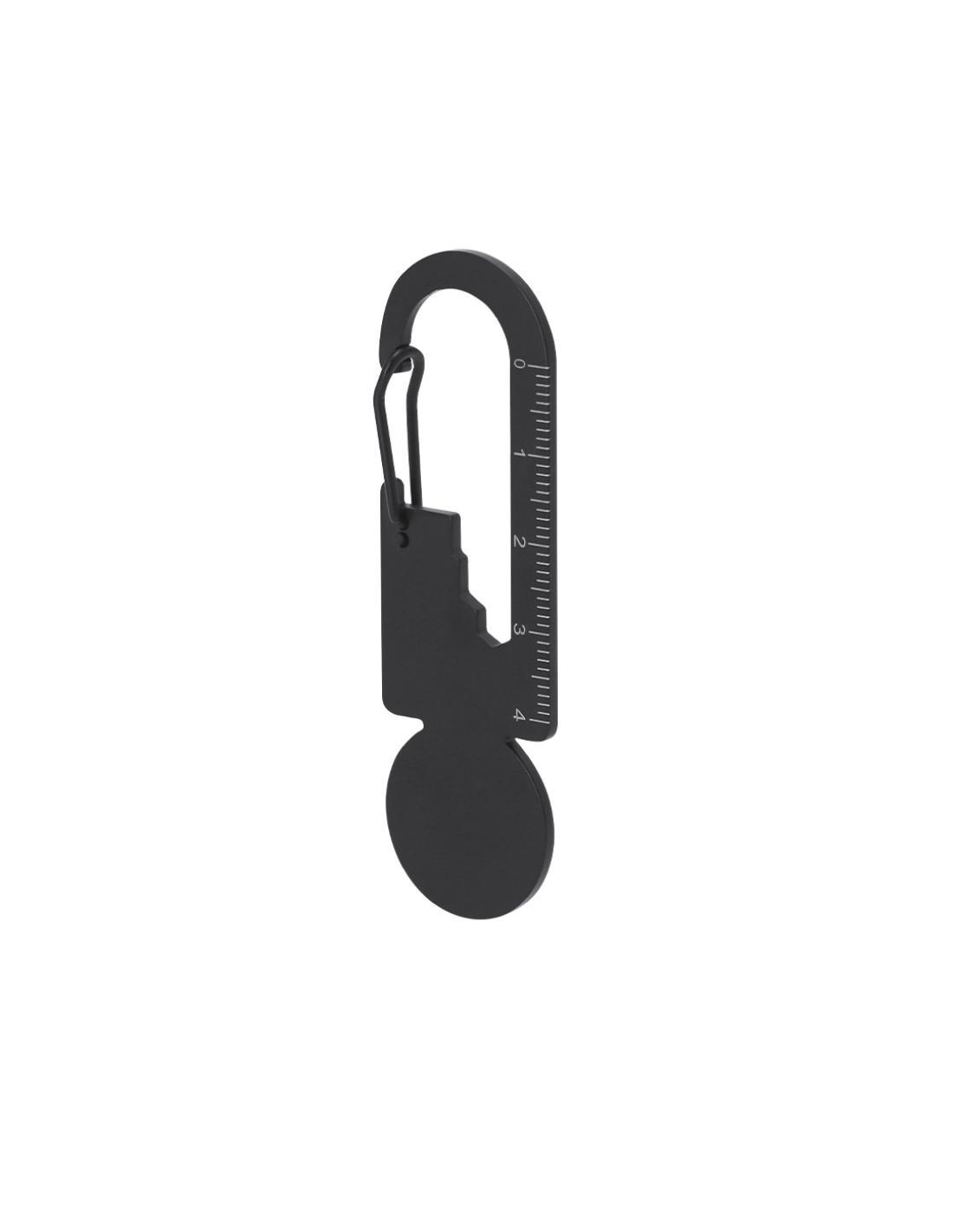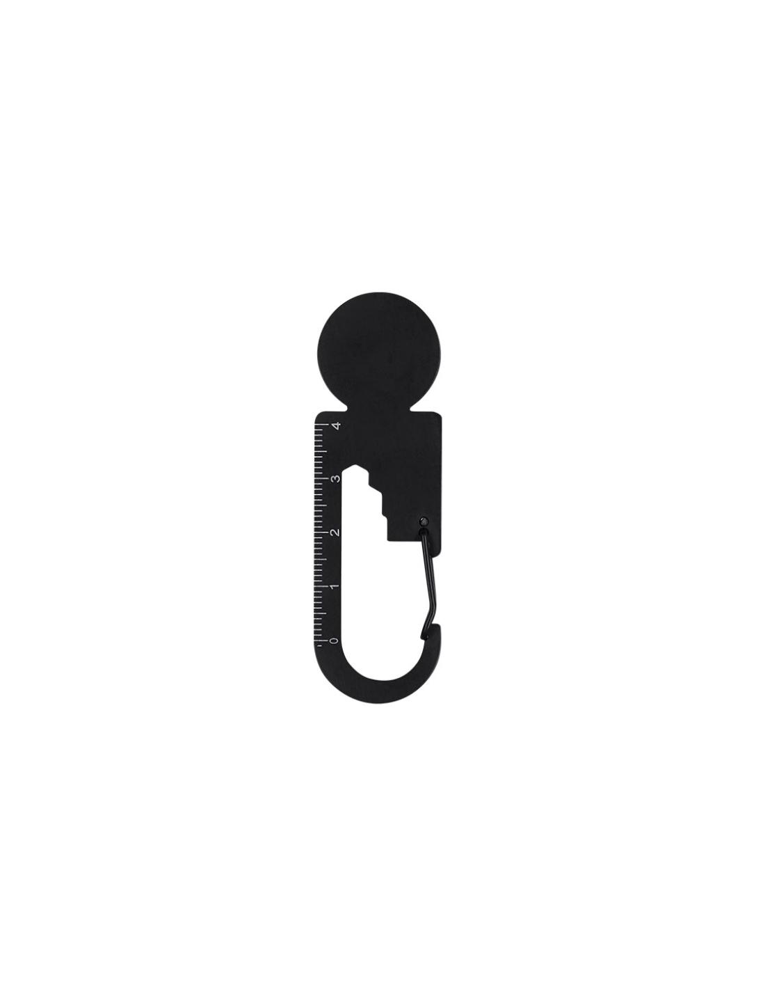 Multiherramienta de acero inoxidable y acabado negro mate. Diseñada para adaptarse a múltiples necesidades, incluye 8 funciones: llave para tuercas hexagonales en varios tamaños, regla para mediciones, abrebotellas, moneda para carro de compra, etc. Con cierre de mosquetón.