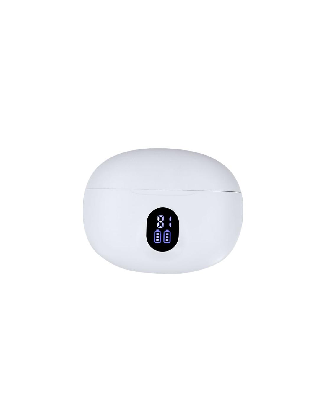 Auriculares intraurales con conexión Bluetooth 5.4, con función manos libres y cancelación de ruidos. De diseño ergonómico, incluyen botón de control táctil integrado en el auricular, con base de carga a juego y pantalla exterior del estado de batería por auricular. Batería integrada de 230 mAh. Manual de instrucciones en español e inglés.