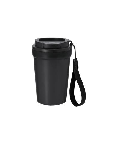 Vaso de 360 ml de capacidad fabricado en resistente PP Reciclado. Cuerpo en acabado frosted translúcido. Tapa hermética en color negro con dosificador de fácil apertura, libre de BPA, con cierre a rosca e incluye una práctica asa de transporte en poliéster. Con certificación Food Grade, garantizando la seguridad cuando los alimentos entran en contacto con el material usado para fabricar el producto. El PP reciclado es un plástico reciclado y altamente reciclable, de gran resistencia y apto para multitud de aplicaciones.