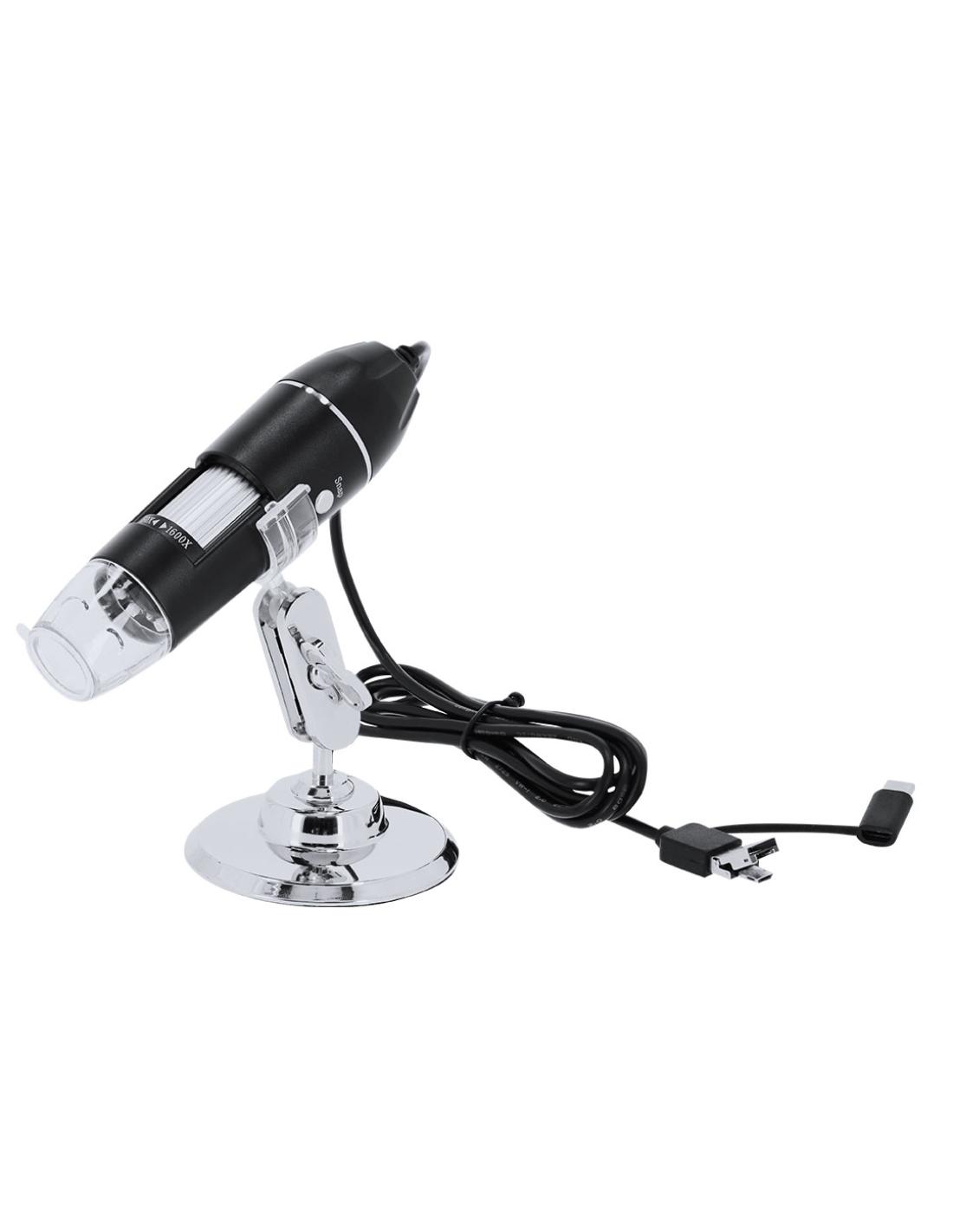 Microscopio digital compacto con aumento de 0-1600X. Luz LED ajustable y resolución personalizable hasta 1600x1200 de forma manual. Incluye soporte ajustable, cable de 140 cm con adaptador USB, Tipo C y Micro USB, para usar en diversos dispositivos. Diseño elegante en negro mate con detalles plateados, compatible con la app para Android. Dispone de regla de calibración y manual en español e inglés