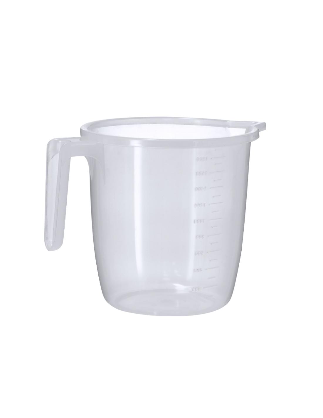 Jarra medidora de 2L fabricada en resistente PP transparente con asa. Con medidor lateral en tramos de 200 ml y 100 ml. Incluye vertedor en el borde para evitar derrames.