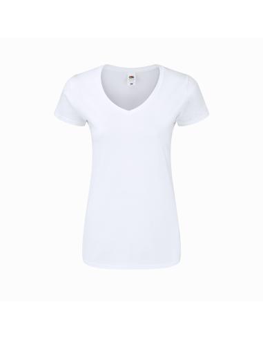 Camiseta para mujer blanca Iconic V-Neck de Fruit Of The Loom. Fabricada en material 100% algodón peinado Ring Spun de 140g/m2 hilado en anillo. De tacto suave y corte entallado, con costuras laterales diseñadas para un ajuste perfecto. Con cuello en pico estrecho de canalé 1x1 y tapeta a juego. Etiqueta fácilmente removible y disponible en tallas XS, S, M, L, XL, XXL.