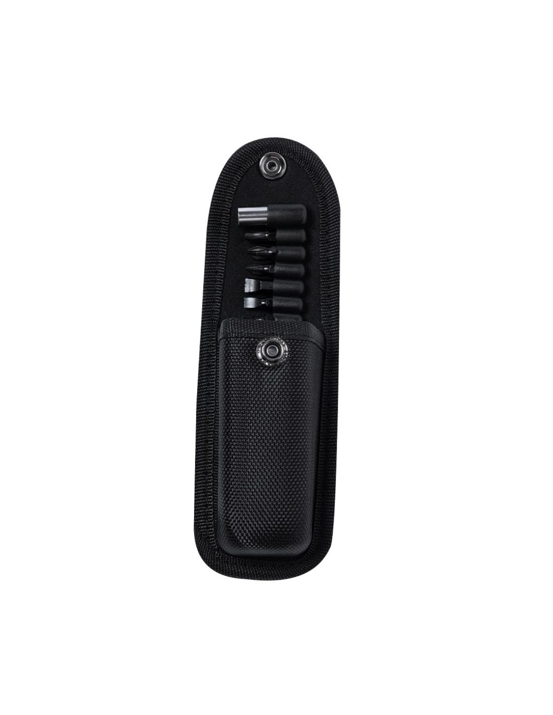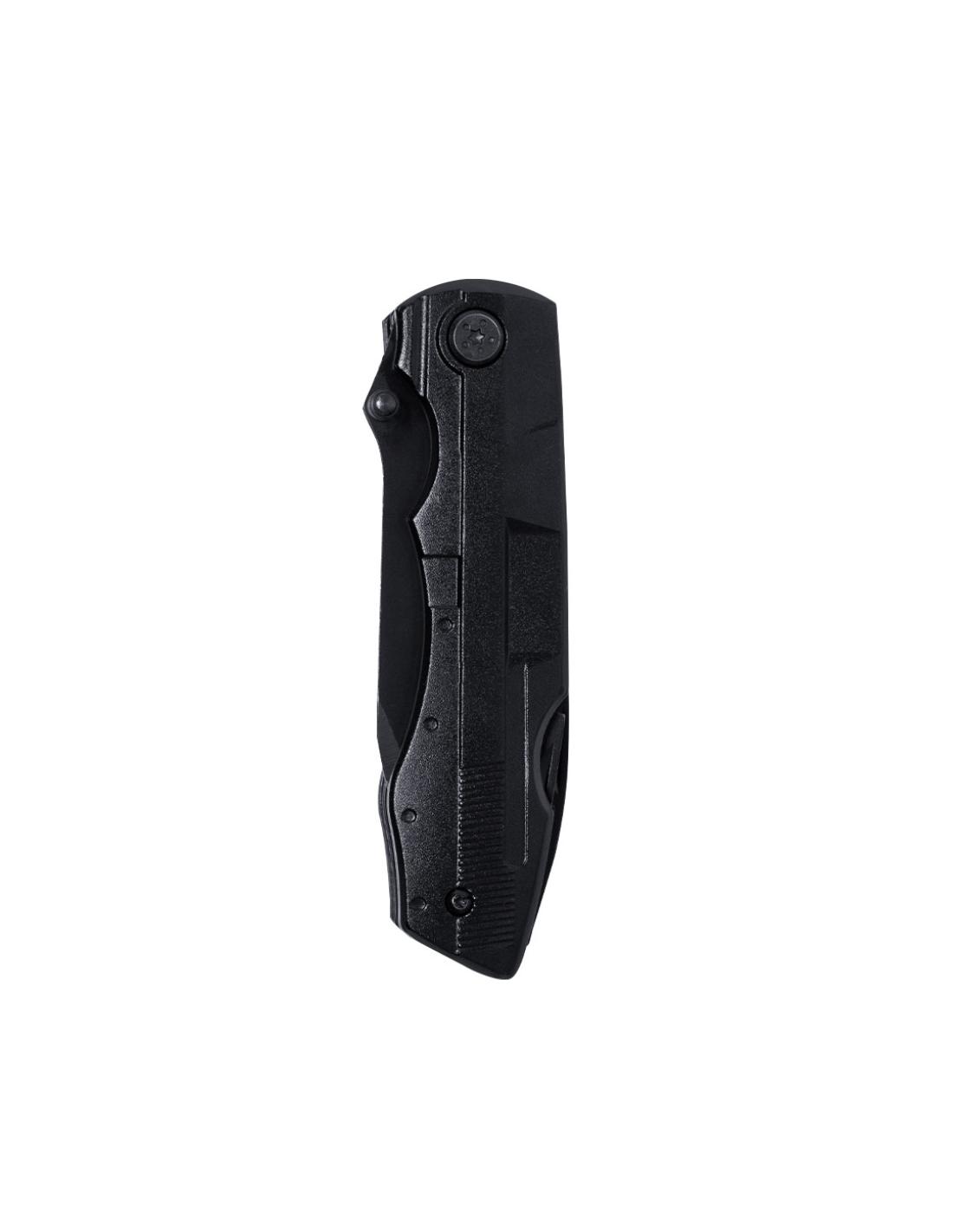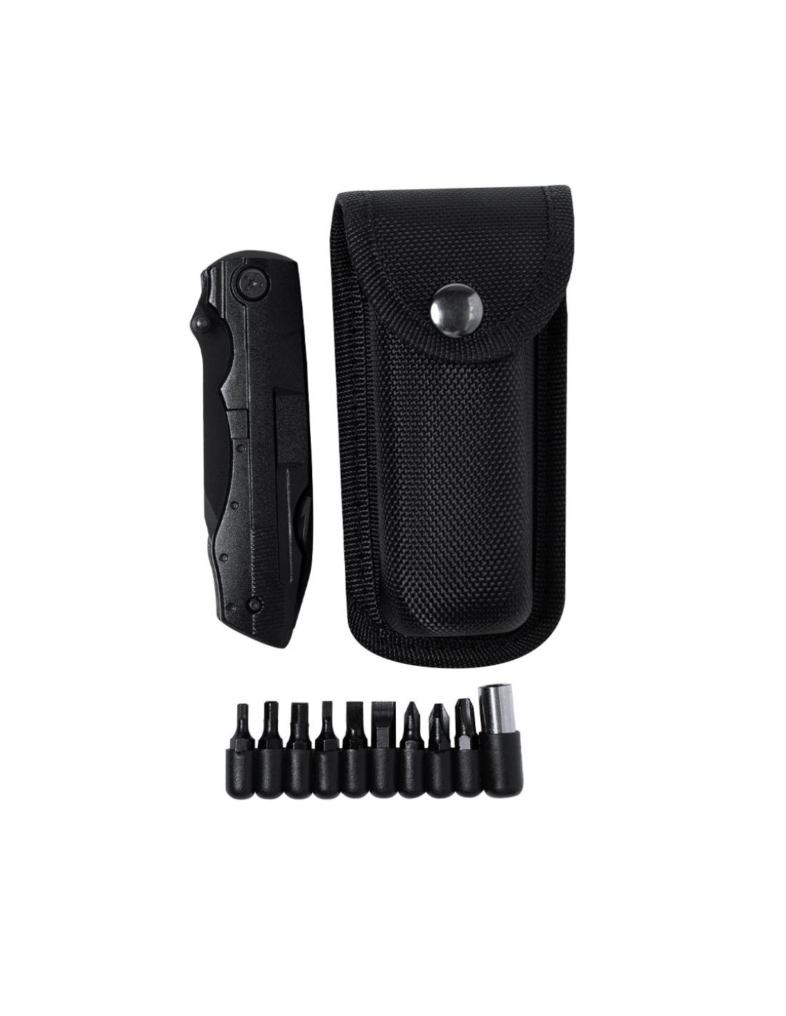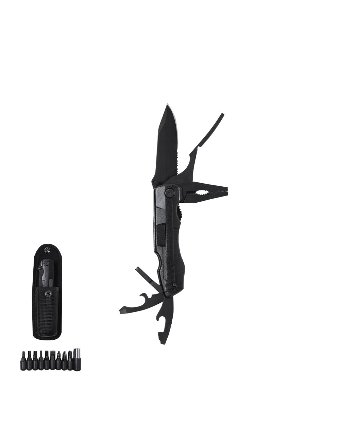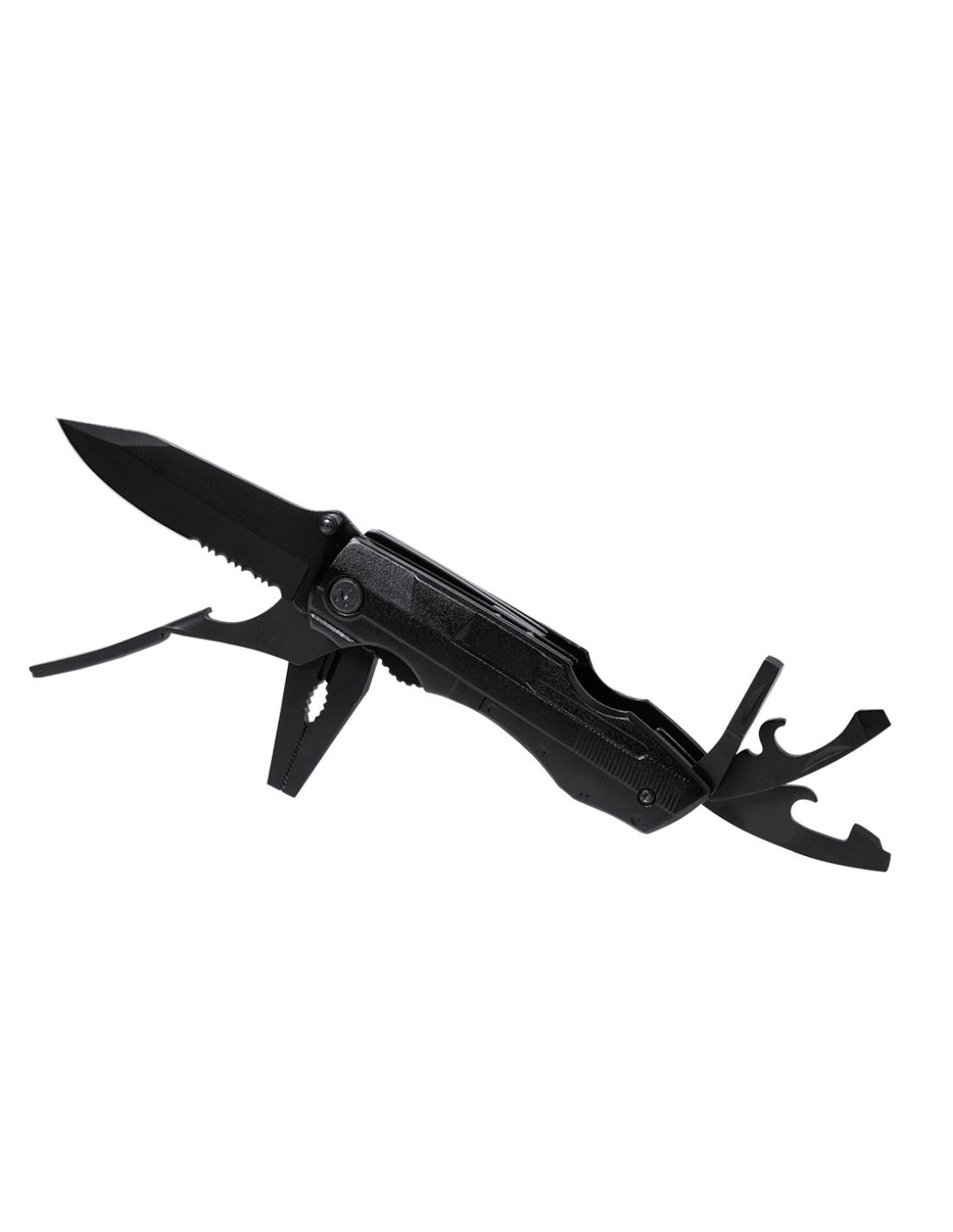 Navaja multiusos de acabado negro en acero inoxidable y resistente empuñadura a juego en aluminio. De diseño plegable y tamaño compacto. Incluye 10 funciones: - Destornillador con múltibles cabezales- Cuchillo de filo liso y dentado-Abrebotellas- Abrelatas- Alicates con cortador de hilosPresentada en práctico estuche de poliéster a juego con accesorio para cinturón.