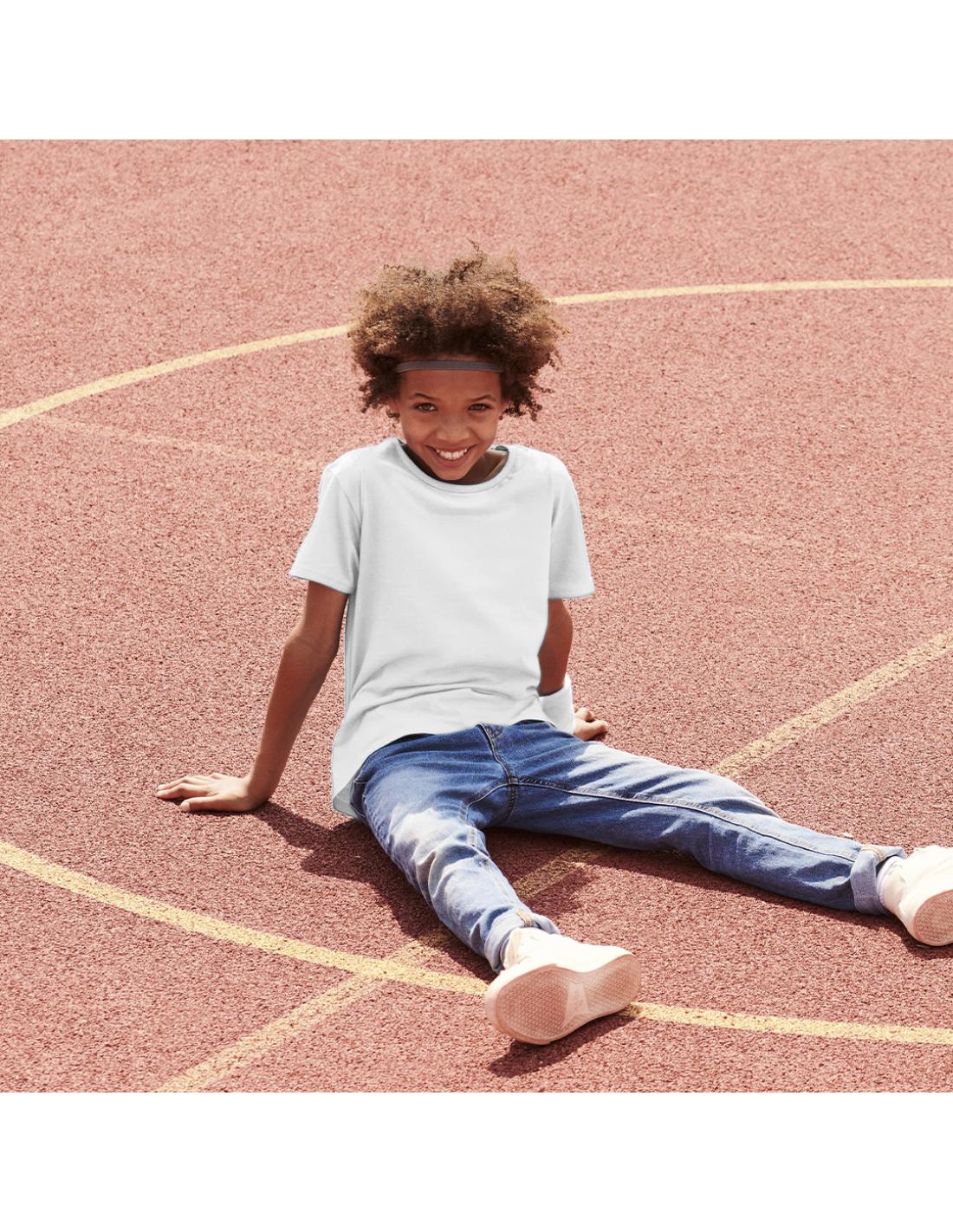 Camiseta para niño blanca Iconic de Fruit Of The Loom. Fabricada en material 100% algodón peinado Ring Spun de 140g/m2. De tacto suave y corte clásico, con cuello redondo estrecho de canalé 1x1 y tapeta a juego. Etiqueta fácilmente removible y disponible en tallas 3-4, 5-6, 7-8, 9-11, 12-13, 14-15.