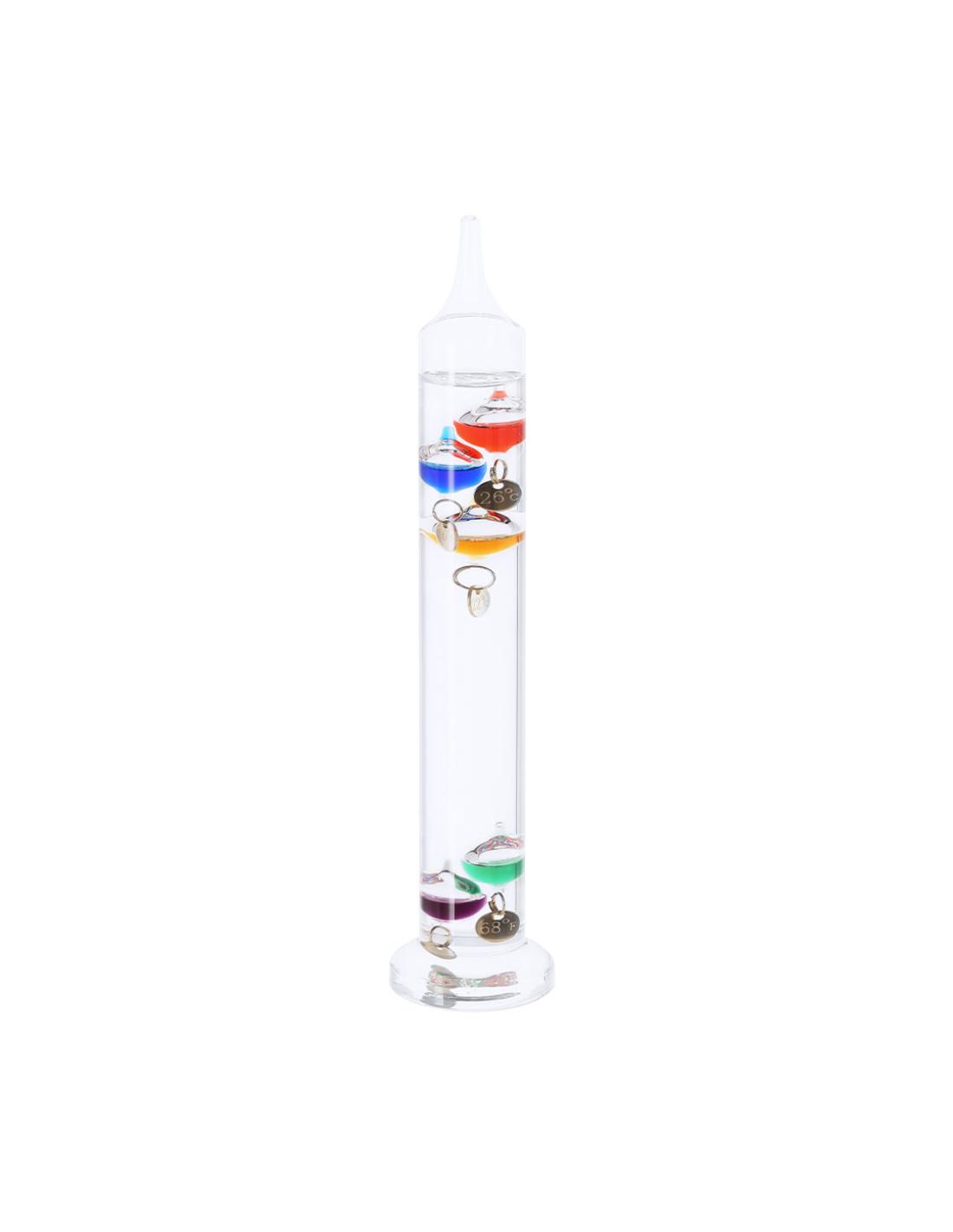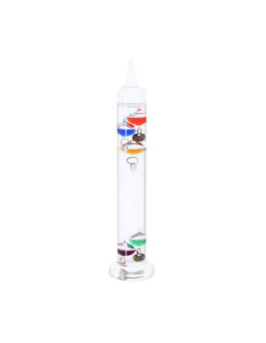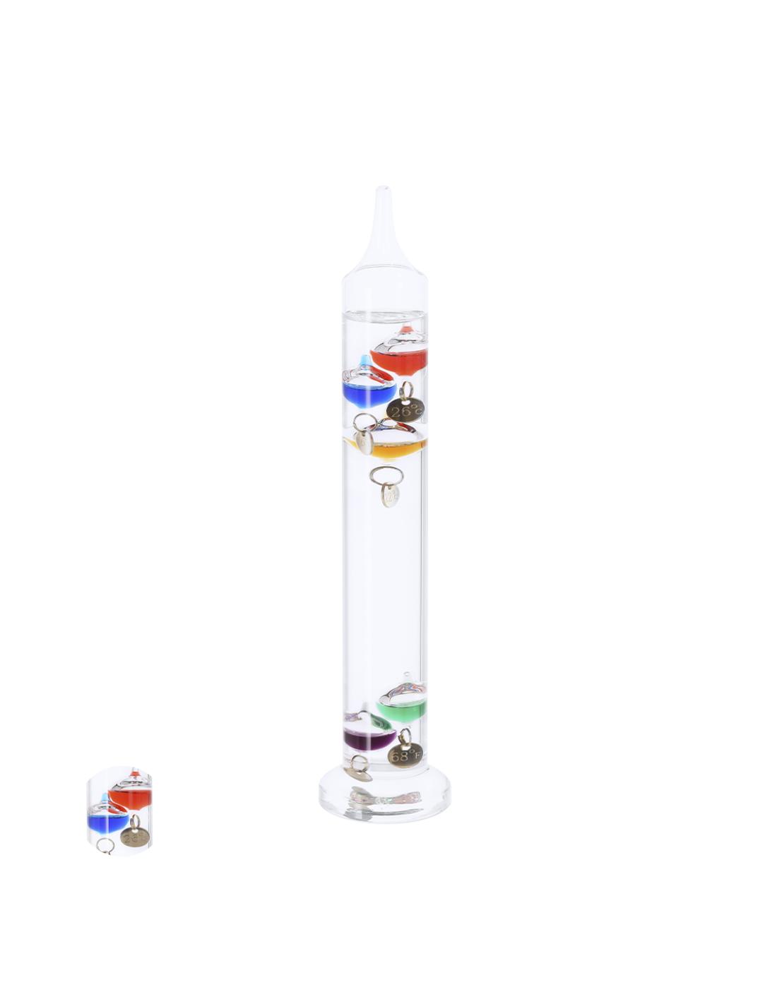 Termómetro Galileo en vidrio de borosilicato de diseño elegante y compacto. Con 5 ampollas de vidrio de colores (morado, verde, naranja, azul y rojo) que indican temperaturas en °C y °F mediante etiquetas doradas, las cuales se mueven por el termómetro en función de la temperatura del exterior.
