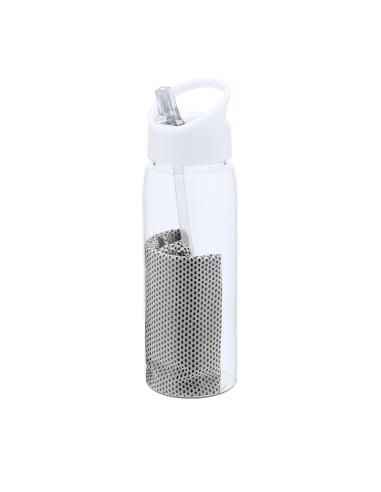 Set de bidón y toalla fabricados en RPET. Bidón de 800 ml de capacidad con sistema de fácil apertura libre de BPA con dosificador de pajita y asa de transporte a juego y toalla a juego de 30x80cm. El material RPET se elabora a partir de plástico reciclado, para así fomentar la reutilización de residuos plásticos y ayudar a la sostenibilidad del planeta.
