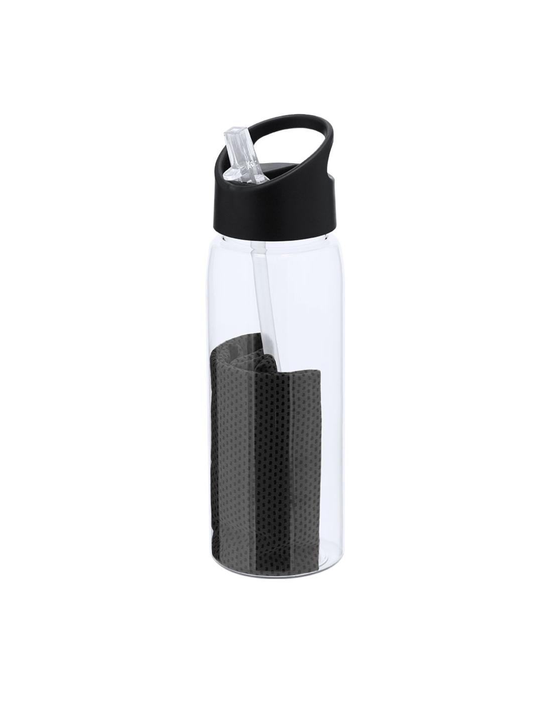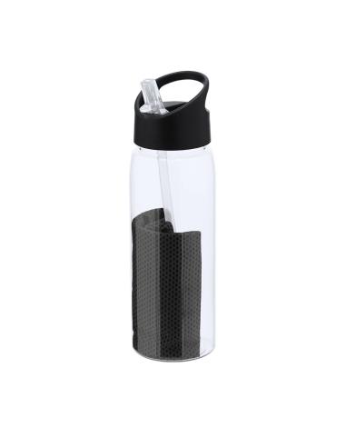 Set de bidón y toalla fabricados en RPET. Bidón de 800 ml de capacidad con sistema de fácil apertura libre de BPA con dosificador de pajita y asa de transporte a juego y toalla a juego de 30x80cm. El material RPET se elabora a partir de plástico reciclado, para así fomentar la reutilización de residuos plásticos y ayudar a la sostenibilidad del planeta.