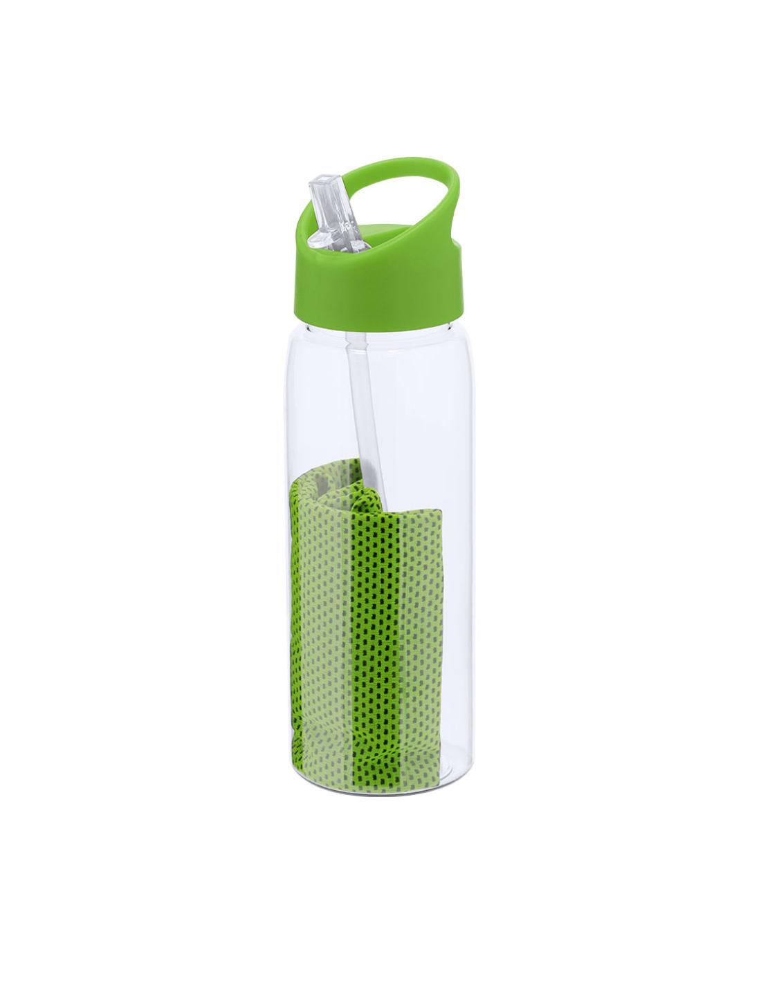 Set de bidón y toalla fabricados en RPET. Bidón de 800 ml de capacidad con sistema de fácil apertura libre de BPA con dosificador de pajita y asa de transporte a juego y toalla a juego de 30x80cm. El material RPET se elabora a partir de plástico reciclado, para así fomentar la reutilización de residuos plásticos y ayudar a la sostenibilidad del planeta.