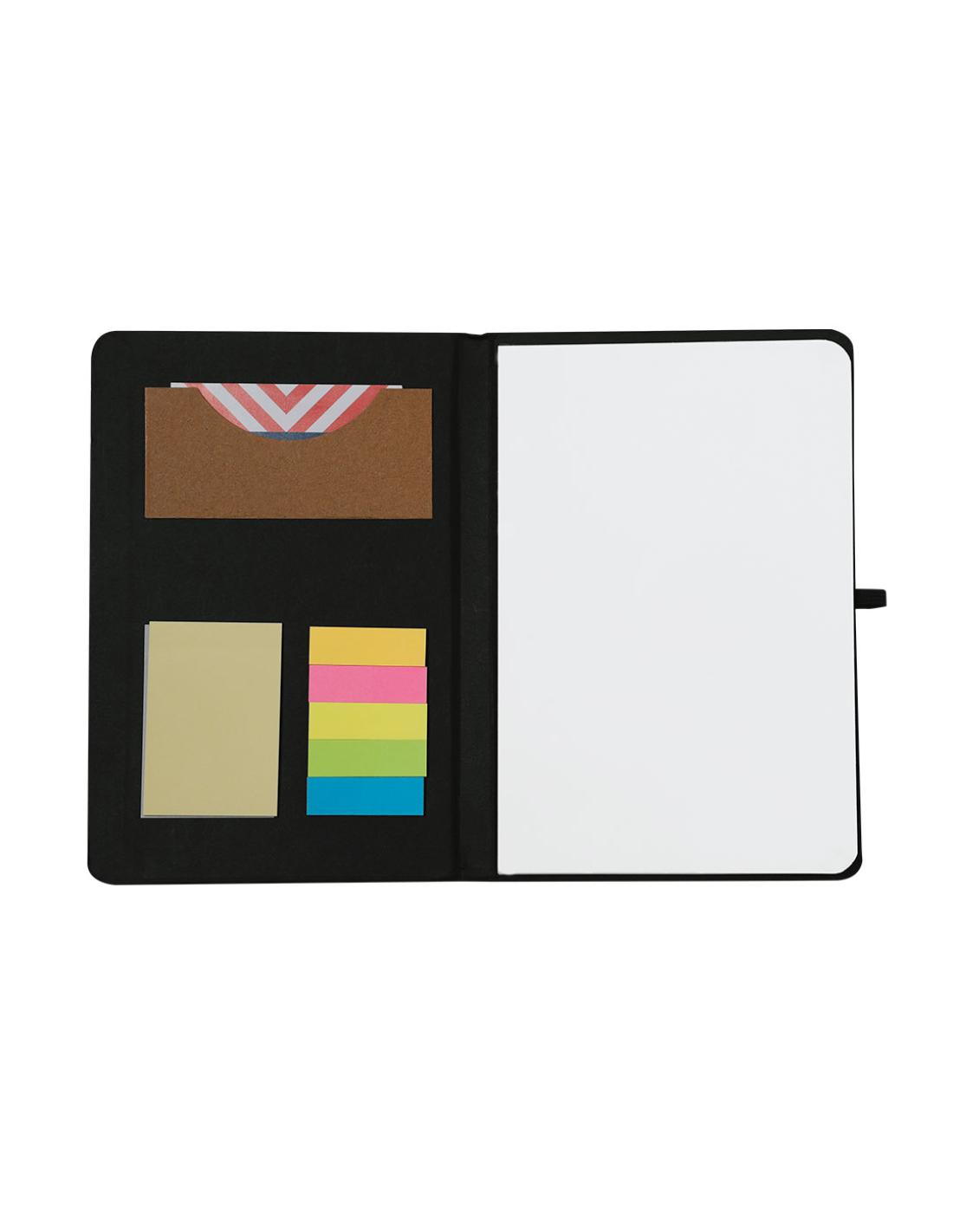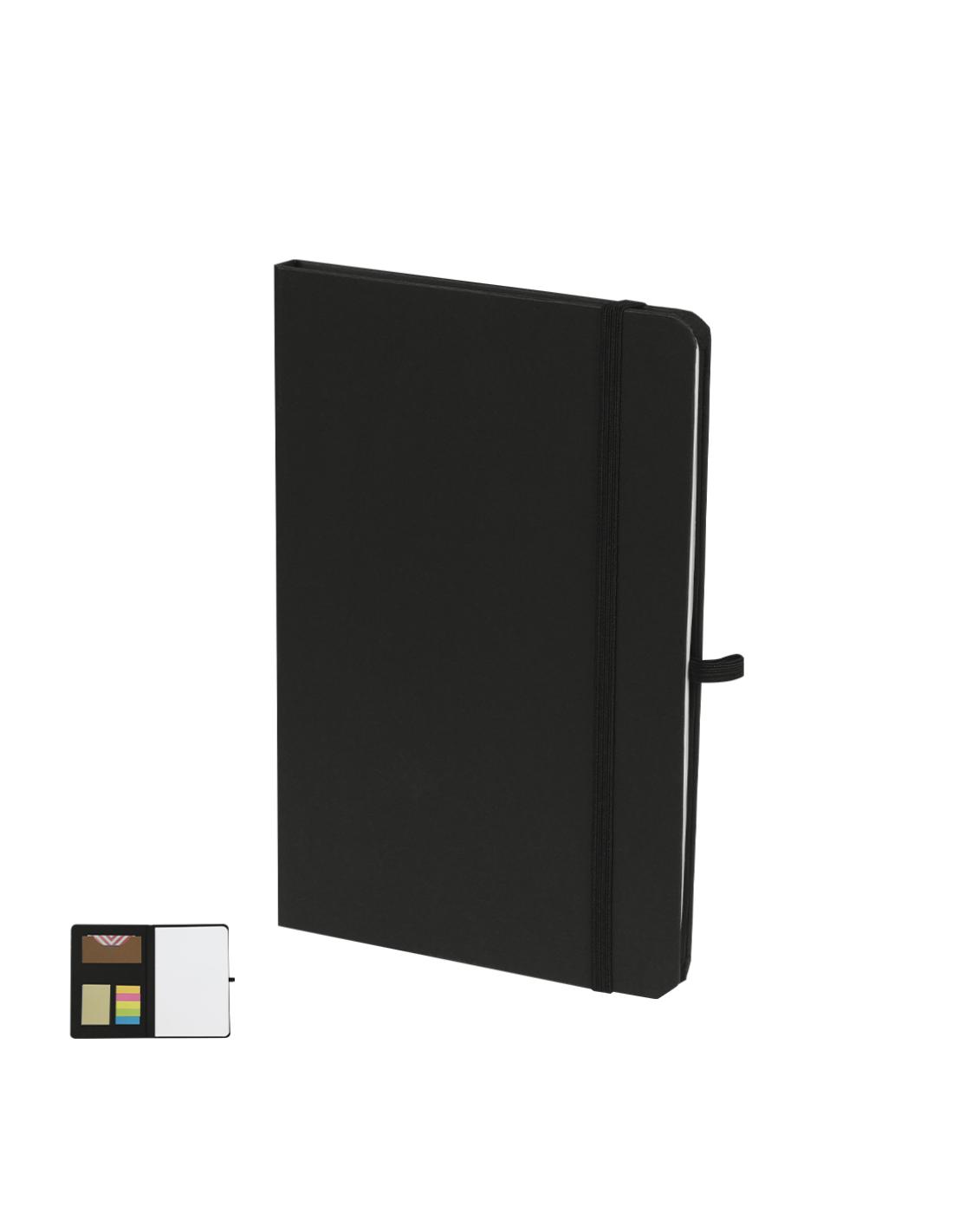 Bloc con notas adhesivas en cartón reciclado. Con tapas rígidas y 80 hojas lisas. En la cubierta interior de la portada incluye: 25 hojas adhesivas amarillas, 125 mini notas adhesivas de variados colores y práctico tarjetero en color kraft. Con soporte para bolígrafos y cinta elástica a juego.El Cartón Reciclado proviene del reaprovechamiento de excedente de fabricaciones y reciclaje de papel en el final de su vida útil, convirtiéndose en un lienzo ecológico y sostenible.
