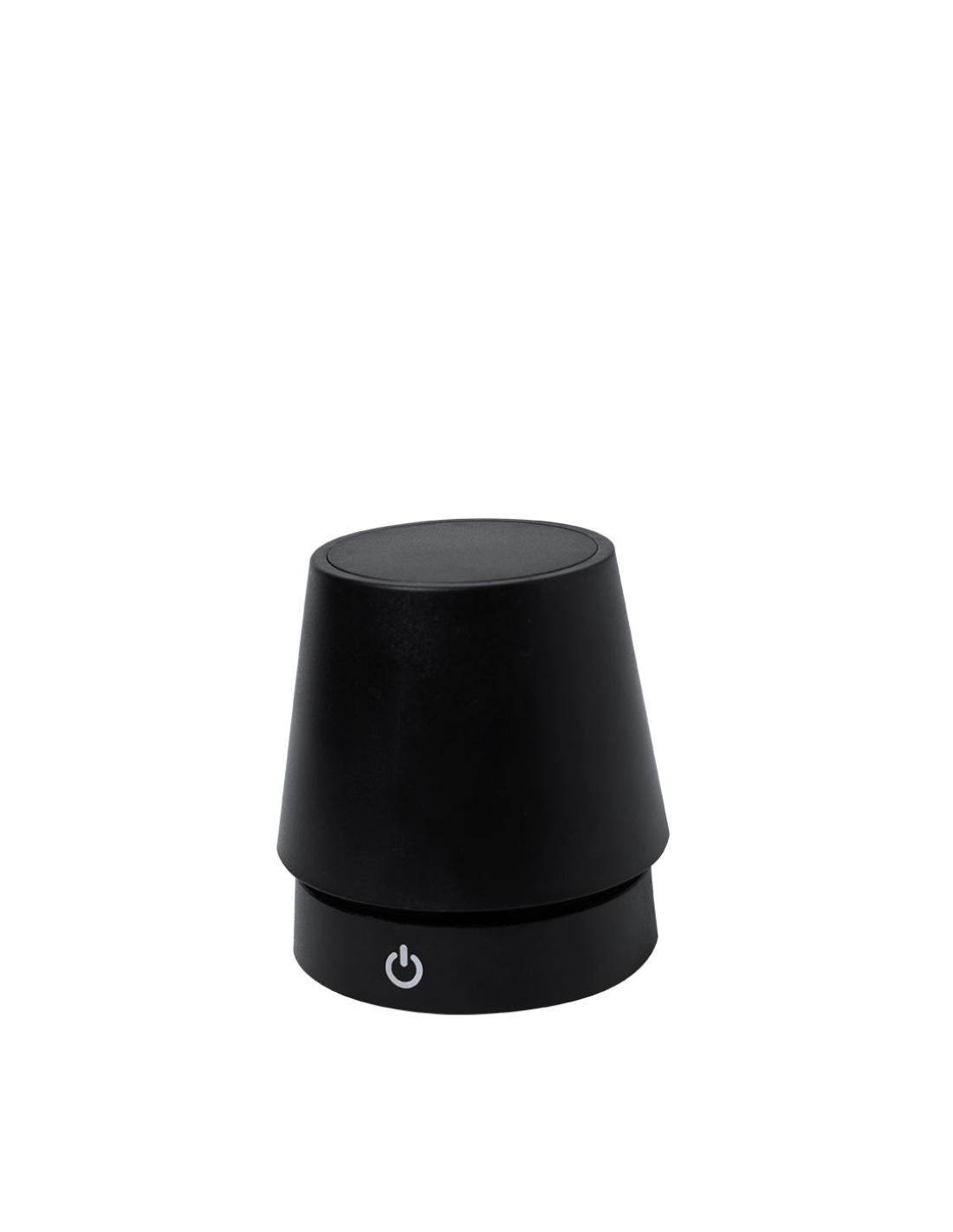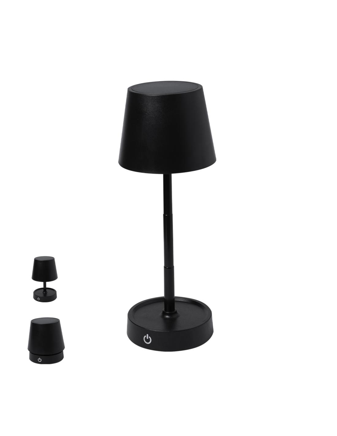 Lámpara de diseño en acabado negro mate. Incluye sistema de regulación de intensidad de luz táctil y con cuerpo plegable para ajustarlo en altura. Equipada con batería de 800mAh recargable por USB Tipo C -cable incluido- y 12 LEDs de luz cálida. Con botón encendido/apagado en la parte trasera.