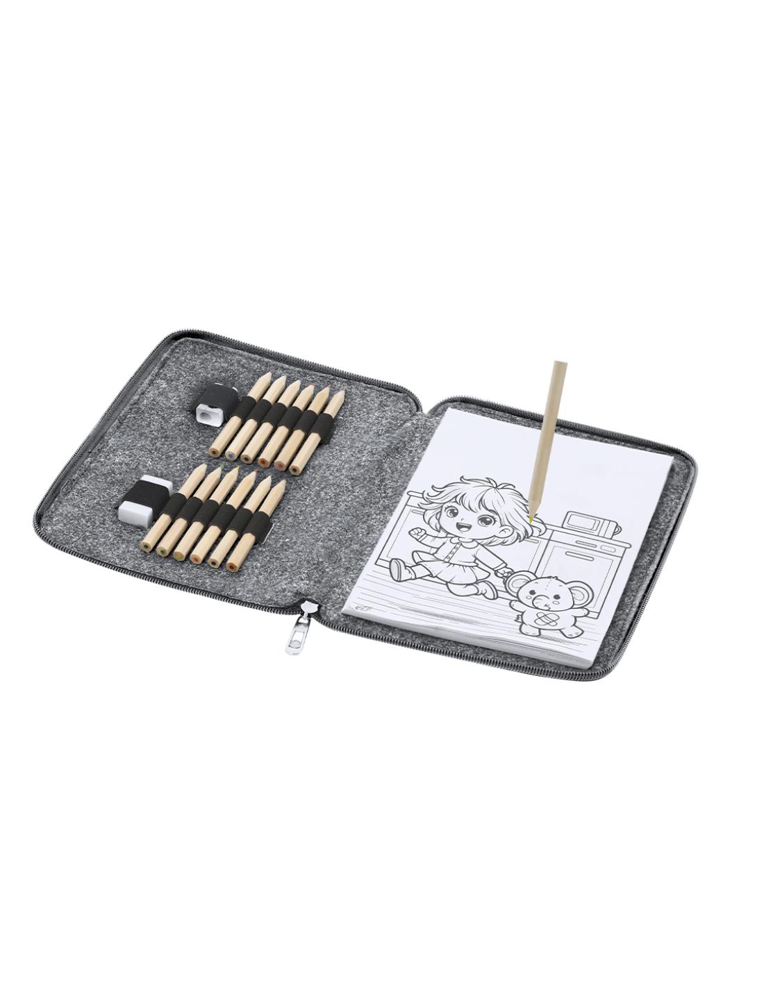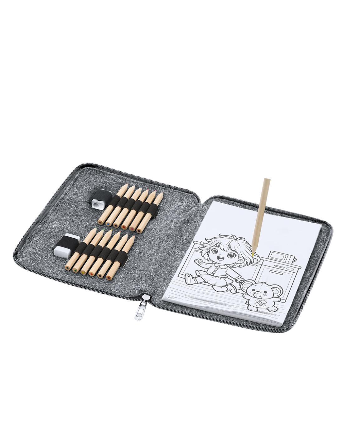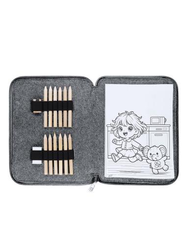 Set de lápices de colores en estuche fabricado en Fieltro RPET. Incluye 11 lápices en diferentes colores de forma hexagonal, 1 goma de borrar, 1 sacapuntas de madera y 60 hojas con divertidos diseños en blanco y negro para colorear. Presentado en un práctico estuche con cierre de cremallera en color bitono e interior con bandas elásticas para organizar los accesorios. Con distintivo de RPET.El fieltro RPET es fruto de la combinación del proceso de reciclaje de materiales plásticos junto con la técnica milenaria de fabricación del fieltro, dando como resultado un material de eco-tendencia que, además de ser de origen reciclado, también se convierte en reciclable.