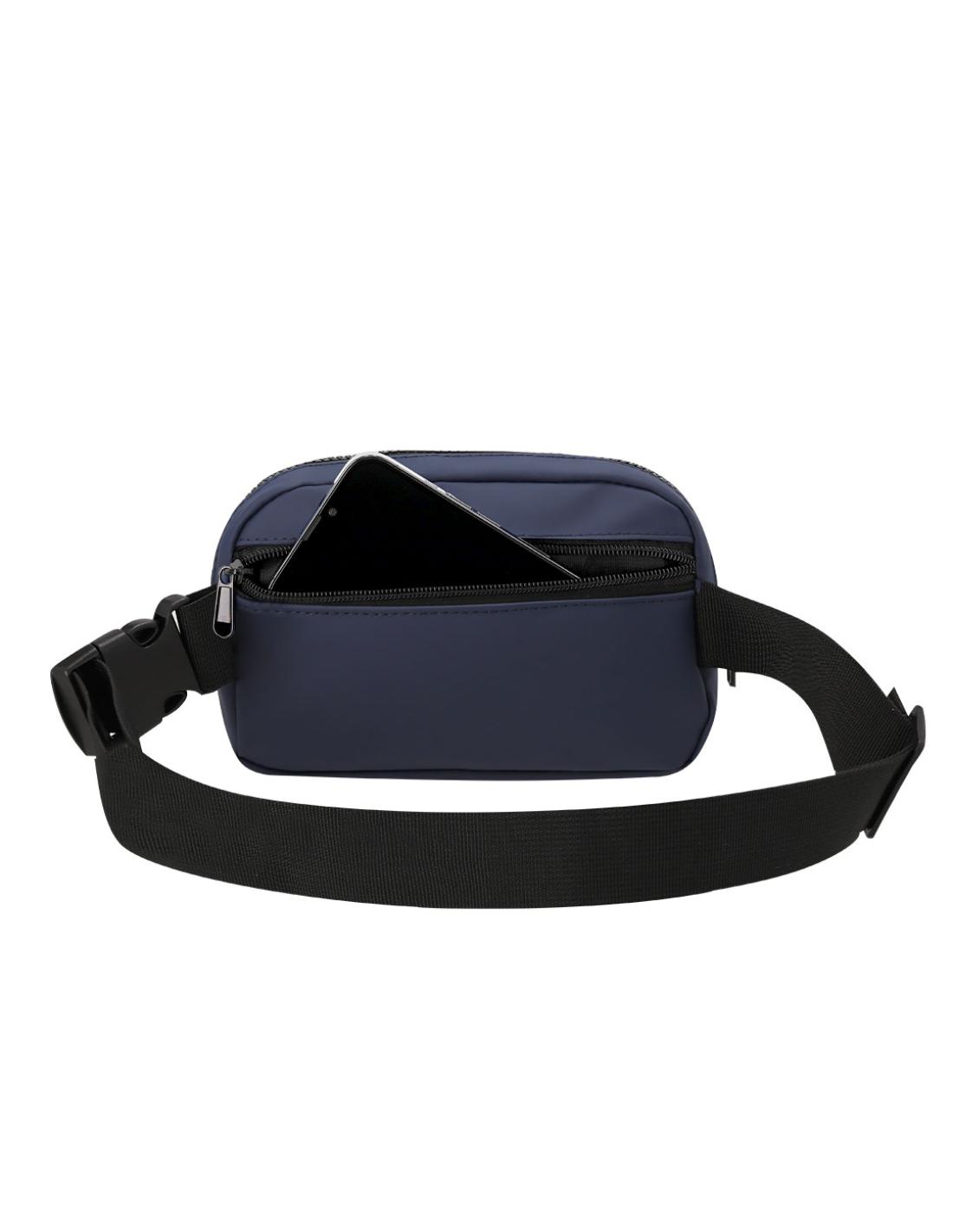 Riñonera de diseño fabricada en PU. Cuenta con un bolsillo central cierre de cremallera y cinta ajustable con cierre de hebilla. Además, incluye bolsillo trasero con cierre de cremallera para mayor seguridad.